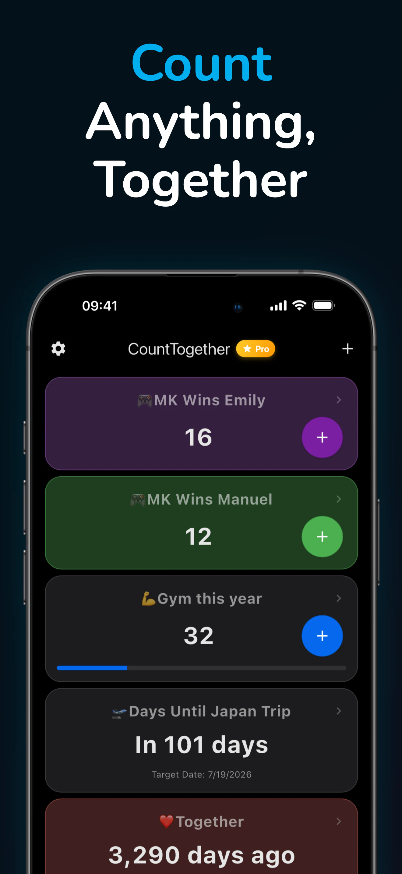 실시간 협업 플랫폼으로, 링크나 QR 코드를 통해 다른 사람들을 초대하여 공유 카운터를 만들 수 있습니다. iOS와 Android 기기 간에 동기화되며, 별도의 가입 절차 없이 바로 사용할 수 있습니다.