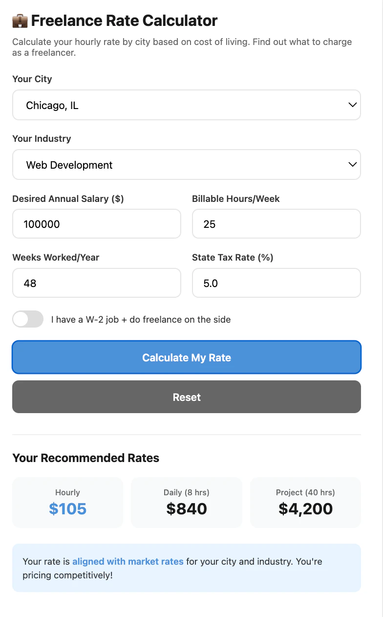 시간당, 일당, 프로젝트별 프리랜서 요율을 무료로 계산해 드립니다. 도시별 생활비를 반영하여 서비스 가격을 경쟁력 있게 책정할 수 있도록 돕습니다. 대부분의 프리랜서 계산기가 고정 요율을 사용하는 반면, 이 도구는 도시별 생활비를 조정하여 뉴욕의 프리랜서가 시카고의 프리랜서보다 동일한 생활 방식을 유지하기 위해 더 많은 비용을 청구해야 하는 점을 고려합니다.