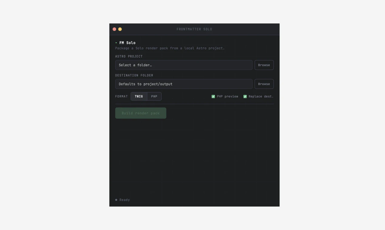 Astro 프로젝트를 기반으로 Twig 및 PHP 템플릿을 생성합니다. 런타임 없이 빌드 시에만 작동하며, 변수 매니페스트와 통합 문서를 포함한 완전한 렌더 팩을 제공합니다.