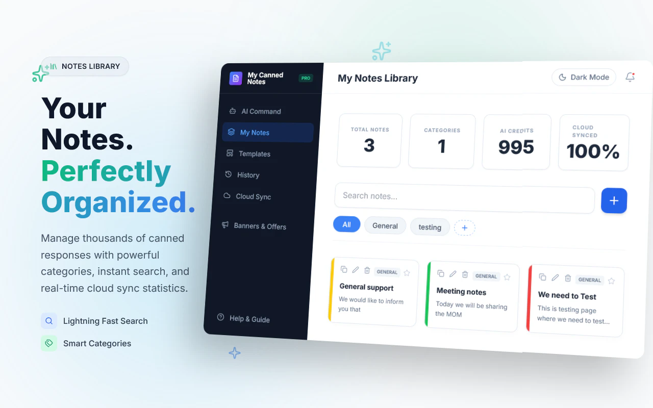 워크플로우를 혁신하세요. AI를 활용하여 미리 작성된 답변을 웹 어디에서든 저장, 정리하고 즉시 삽입할 수 있습니다. 중요한 메모는 플로팅 스티커 메모로 화면에 고정할 수 있습니다. 고객 지원, 채용 담당자, 영업 담당자에게 이상적입니다. 반복적인 문구 입력은 이제 그만!