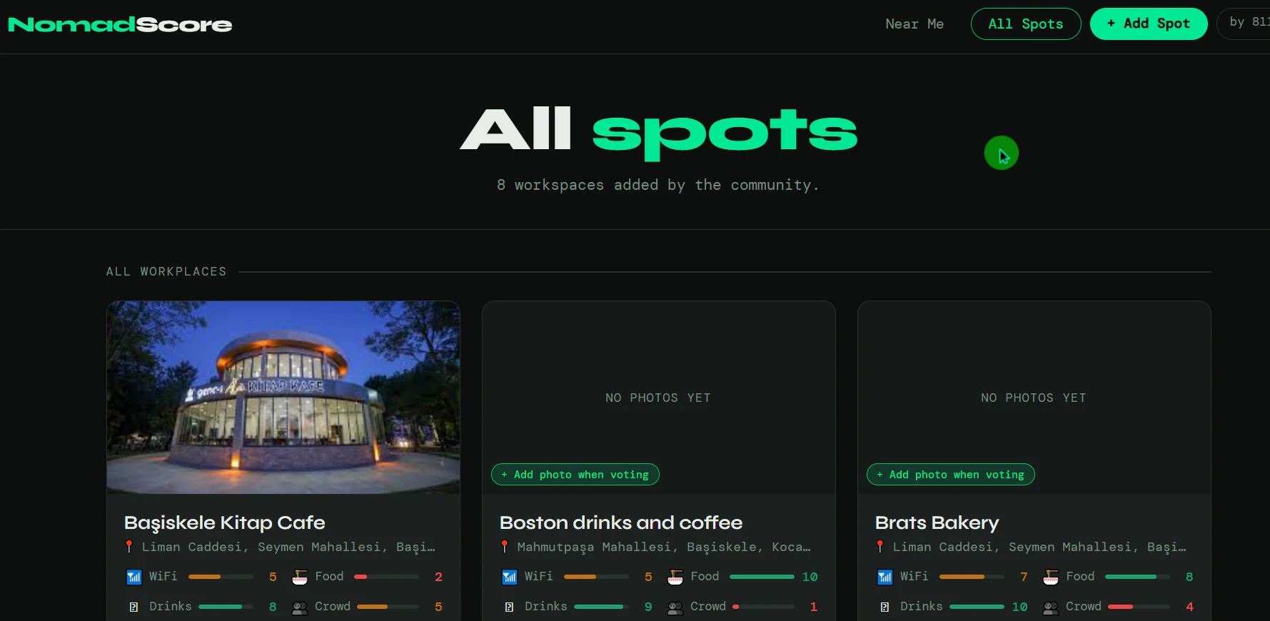 뜨거운 햇볕 아래 원격 근무 중 집중할 공간을 찾다가 에어컨이 꺼진 만원 스타벅스를 발견했습니다. 땀과 불안정한 Wi-Fi는 피하고 싶어 조용하고 책으로 가득하며 시원한 숨겨진 카페를 찾아냈습니다. 이러한 경험을 바탕으로 NomadScore를 만들었습니다. Wi-Fi, 콘센트, 그리고 가장 중요한 에어컨 상태를 추적하는 미니멀한 도구로, 불필요한 기능이나 광고 없이 GPS 기반으로 다음 집중 허브를 찾는 데 도움을 줍니다.