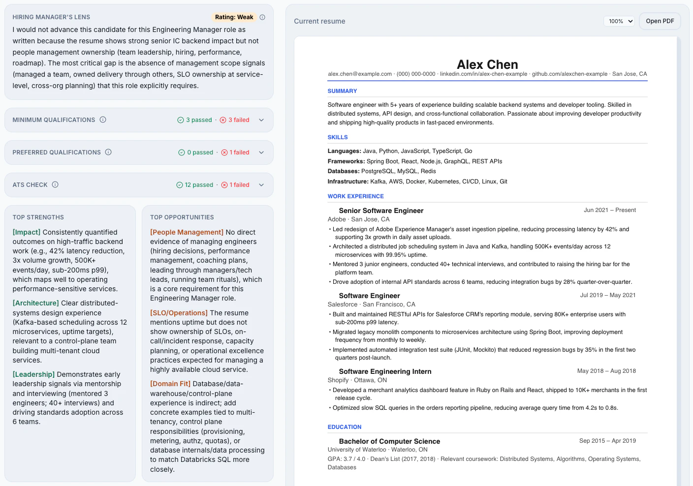 기술 직무 이력서를 상위권 기술 기업 채용 관리자의 관점에서 검토하여, 지원자의 영향력, 역량 수준, 업무 범위를 평가합니다. 소프트웨어 엔지니어, 데이터 과학자, PM, 엔지니어링 관리자 등을 위해 설계되었습니다. 첫 검토는 무료로 제공됩니다.