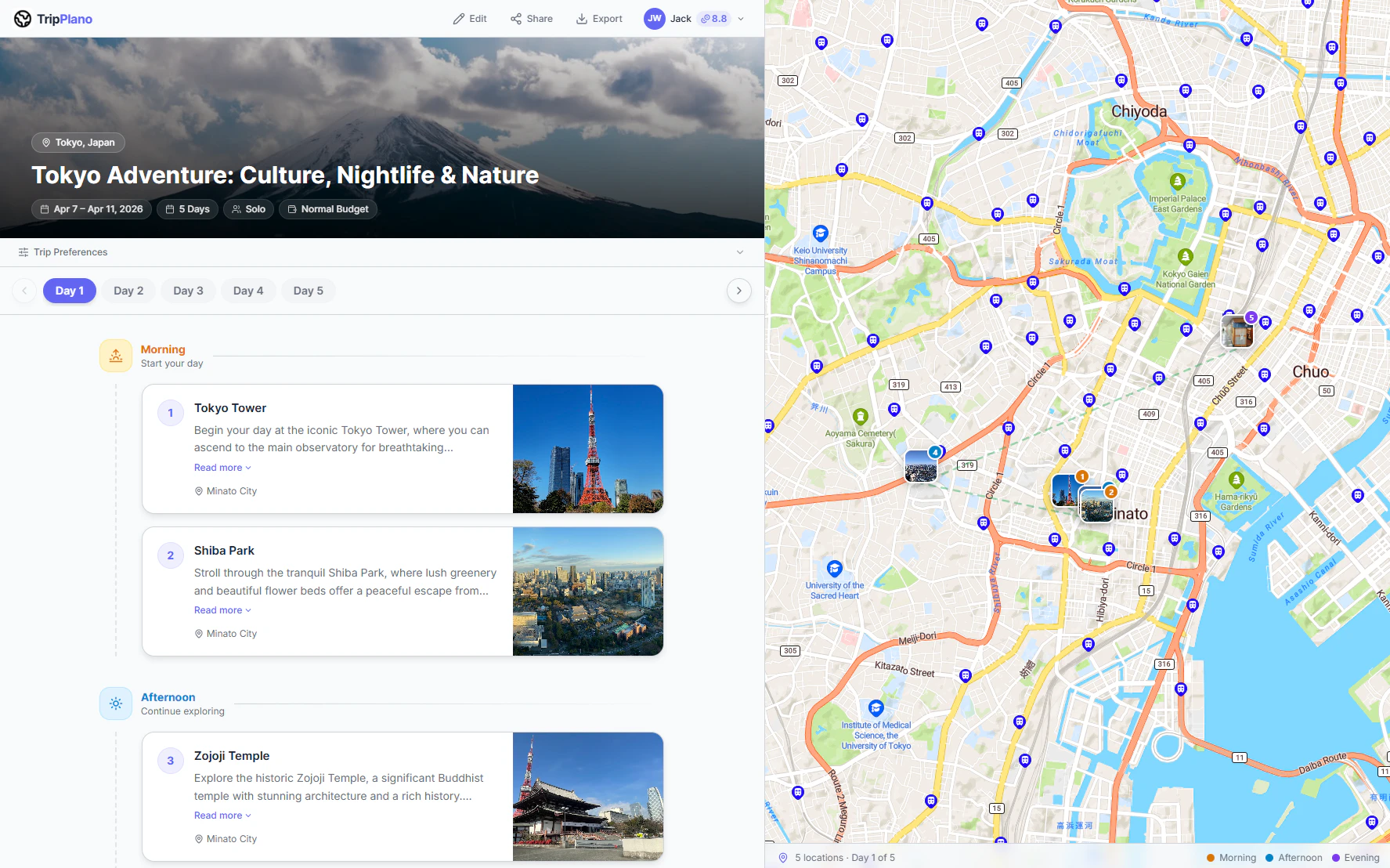 활동, 대화형 지도, 사진을 포함한 완벽한 일별 여행 일정을 몇 초 만에 생성합니다. 계정 없이도 바로 사용해 볼 수 있습니다. 목적지, 날짜, 관심사를 입력하기만 하면 여행 준비가 완료됩니다.
