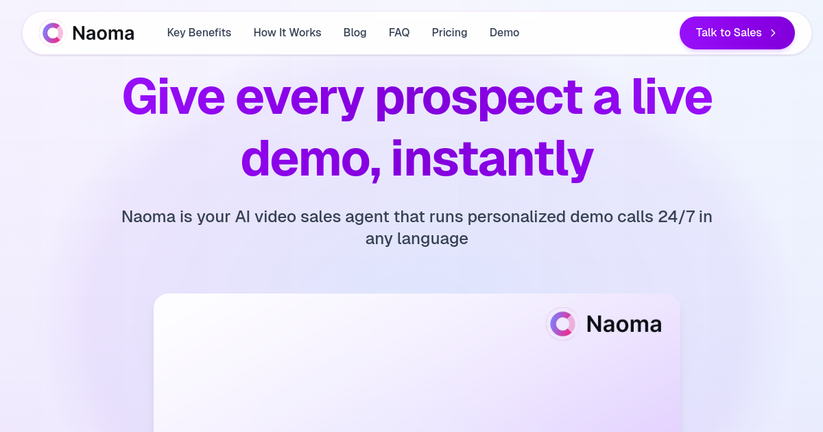 ‘데모 예약’을 ‘지금 AI 데모 받기’로 전환하세요. Naoma는 B2B SaaS 기업을 위한 최초의 비디오 AI 데모 에이전트로, 24시간 연중무휴로 모든 언어로 브라우저 내에서 실시간 맞춤형 데모를 제공합니다. 실제 제품 흐름을 클릭하고, 질문에 답변하며, 잠재 고객을 검증하고, CRM, 영업 캘린더 또는 결제로 연결합니다. 사람과 유사한 아바타, 브랜드 마스코트 또는 보다 격식 있는 모습 중에서 선택하여 잠재 고객의 참여를 유도할 수 있습니다.