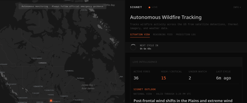 Signet은 미국 본토를 24시간 내내 모니터링하는 자율 산불 인텔리전스 요원입니다. NASA 위성 데이터, NOAA 이미지 및 날씨, 연료 모델, 지형, 노출 데이터를 결합하여 사건을 추적하고, 전망을 생성하며, 화재 행동을 예측합니다. 이 요원은 무엇을 조사할지 결정하고, 예측을 하며, 다음 위성 통과 시 이를 검증합니다. 주목할 만한 화재 활동이 인근에서 감지되면 ZIP 코드로 가입하여 무료 알림을 받으세요.