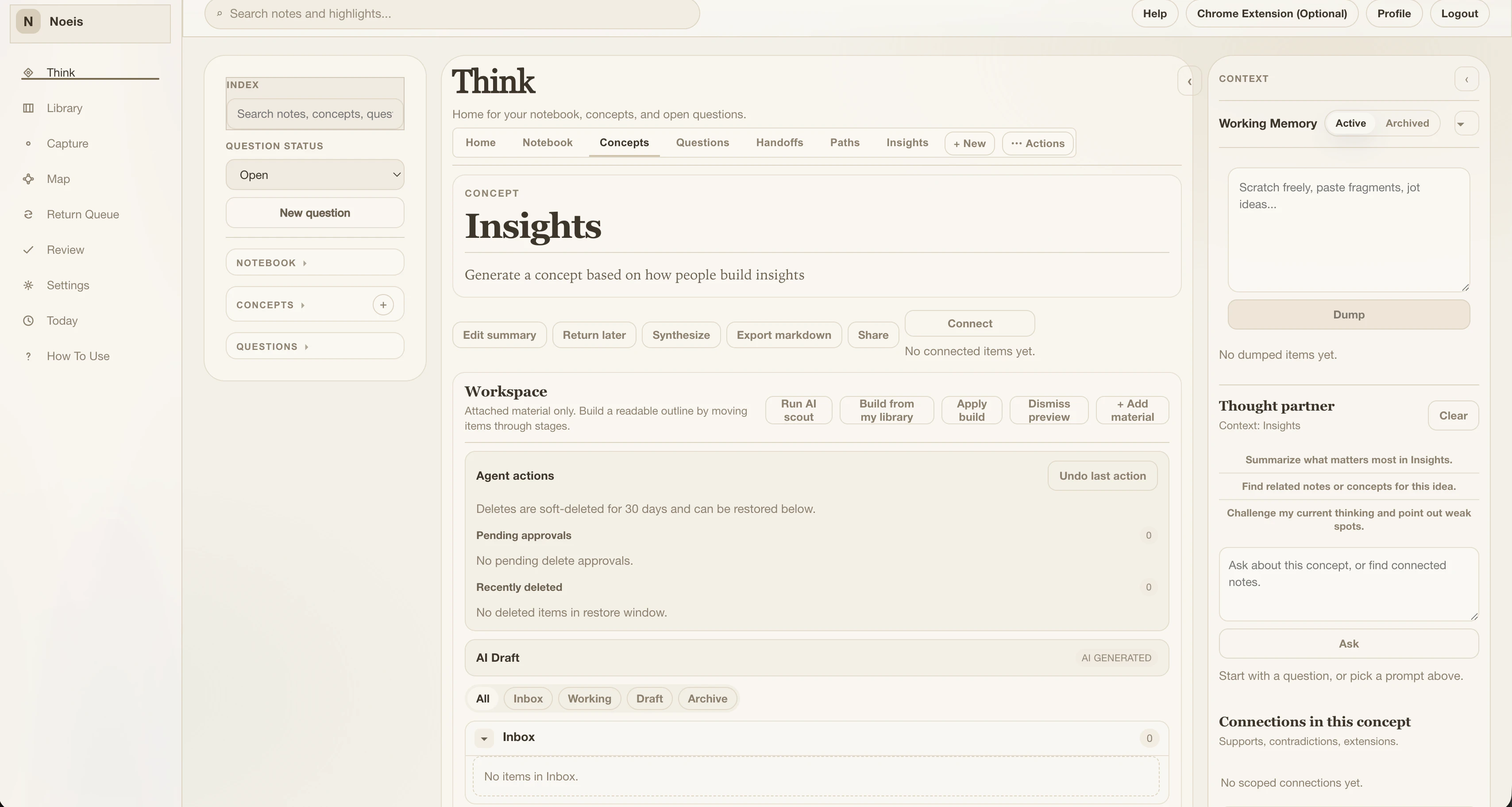 아이디어를 포착하고, 검색하고, 연결하고, 발전시키는 전 과정을 지원하는 노트 필기 시스템입니다. 의미론적 검색으로 중요한 내용을 찾고, 관련 하이라이트로 숨겨진 연결고리를 발견하며, 개념 작업 공간에서 아이디어를 성장시킬 수 있습니다. 당신의 개인 AI 비서가 사고 과정을 함께 합니다.