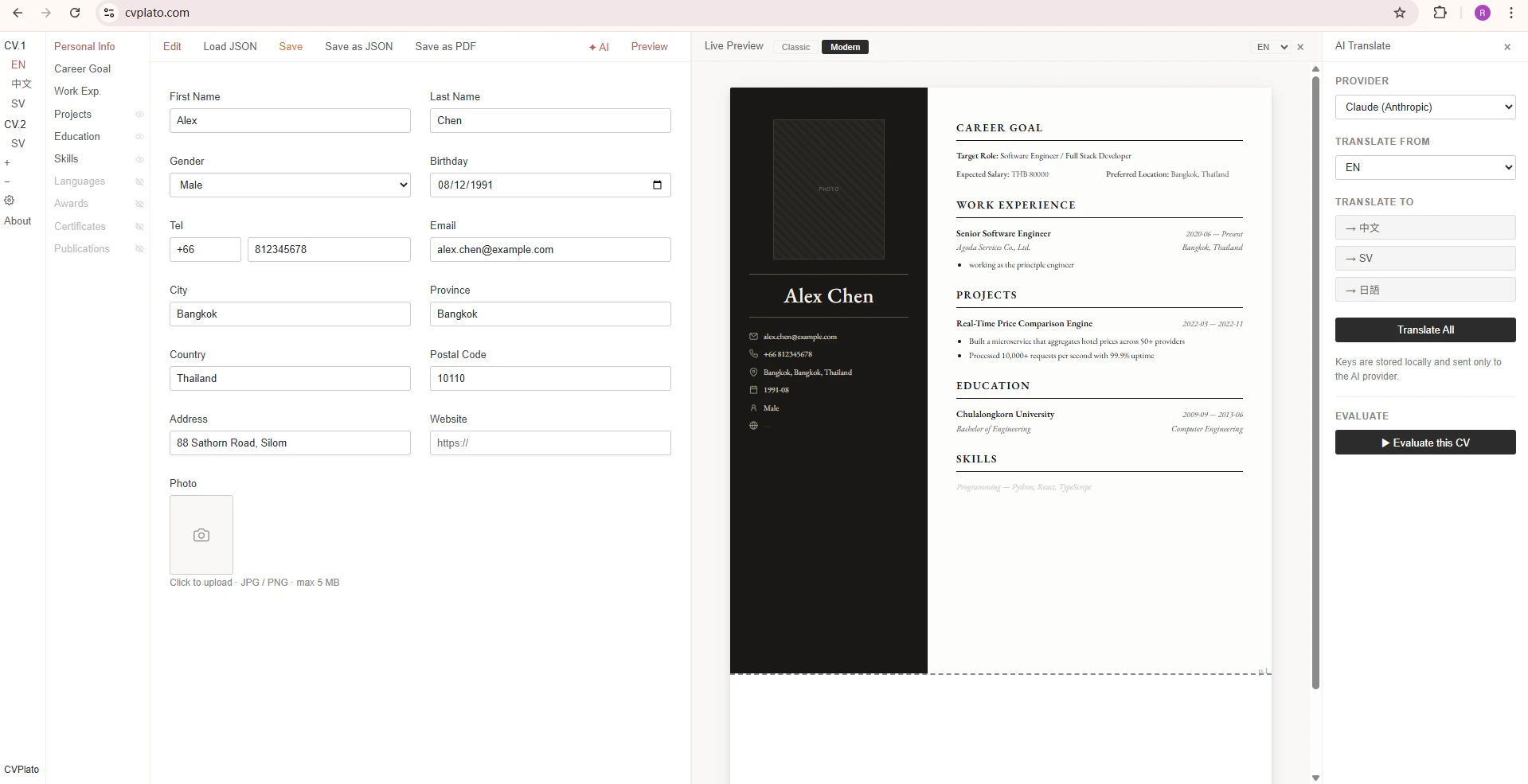 한 번의 작성으로 다양한 언어의 이력서를 만들 수 있습니다. 실시간 미리보기, PDF 내보내기, AI 번역 기능을 무료로 제공하며, 별도 가입 없이 이용 가능합니다.