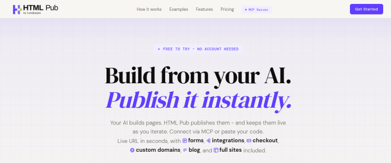 MCP를 통해 AI 생성 HTML을 즉시 게시하세요. Claude, ChatGPT 또는 모든 AI 도구는 채팅을 떠나지 않고 라이브 URL을 구축하고 배포할 수 있습니다. 웹사이트, 랜딩 페이지, 결제 기능이 있는 상점, 블로그, 포트폴리오, 프로토타입 등 모든 것이 몇 초 만에 라이브됩니다. 사용자 지정 도메인. 양식 및 통합. 시각 편집기 및 AI 편집. 분석, 전환 및 히트맵. 저장소 없음. 배포 파이프라인 없음. 호스팅 구성 없음. 좋아하는 AI를 통해 아이디어를 라이브 사이트로.