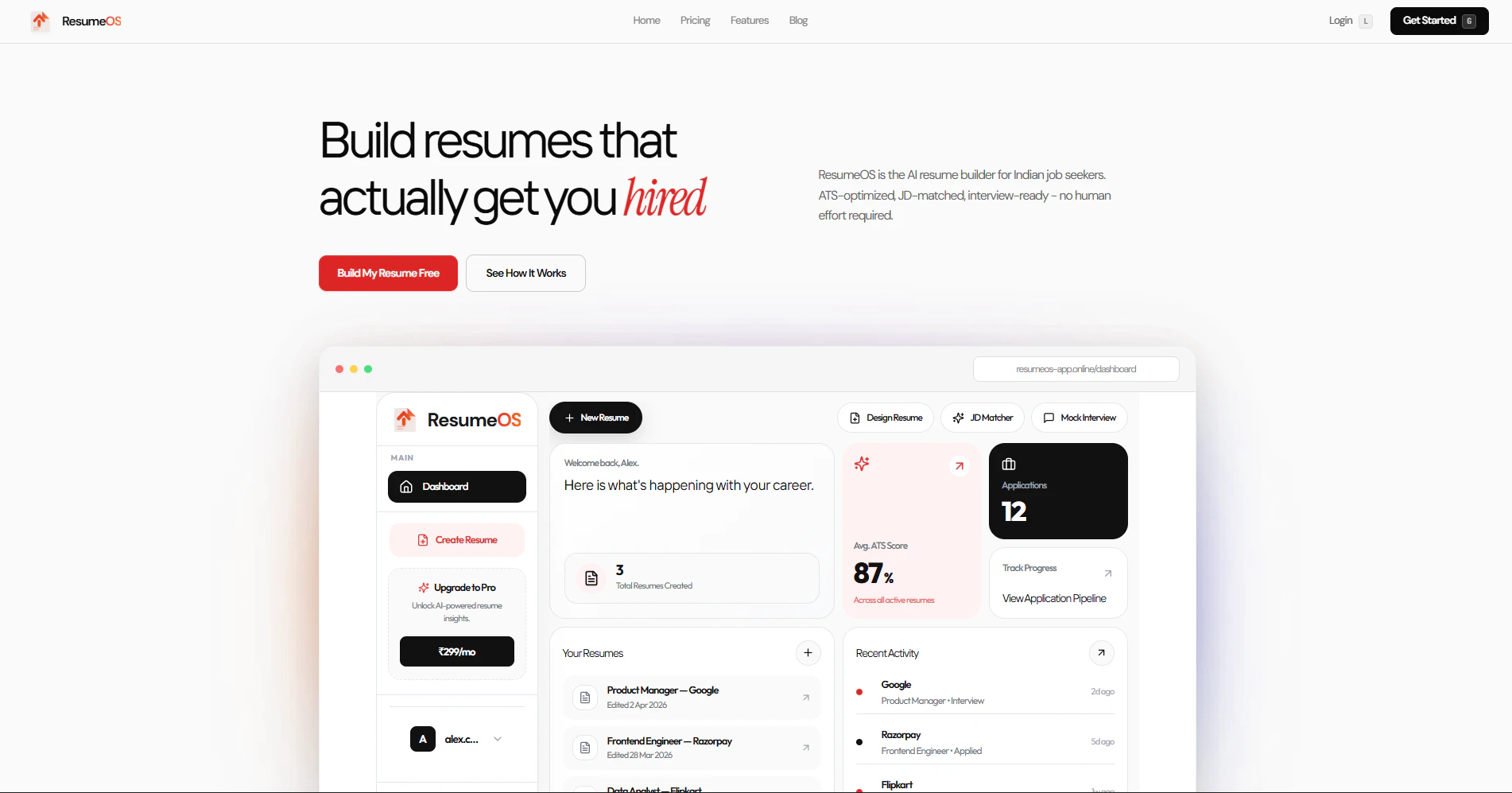인도 신입 구직자 이력서의 75%는 채용 담당자가 보기도 전에 ATS 스캐너로 인해 탈락합니다. ResumeOS는 인도 구직자를 위해 특별히 설계된 AI 기반 이력서 작성 도구로, ATS 점수 측정, 직무 기술서 매칭, 면접 준비 및 지원 현황 추적 기능을 제공하여 이러한 문제를 해결합니다.