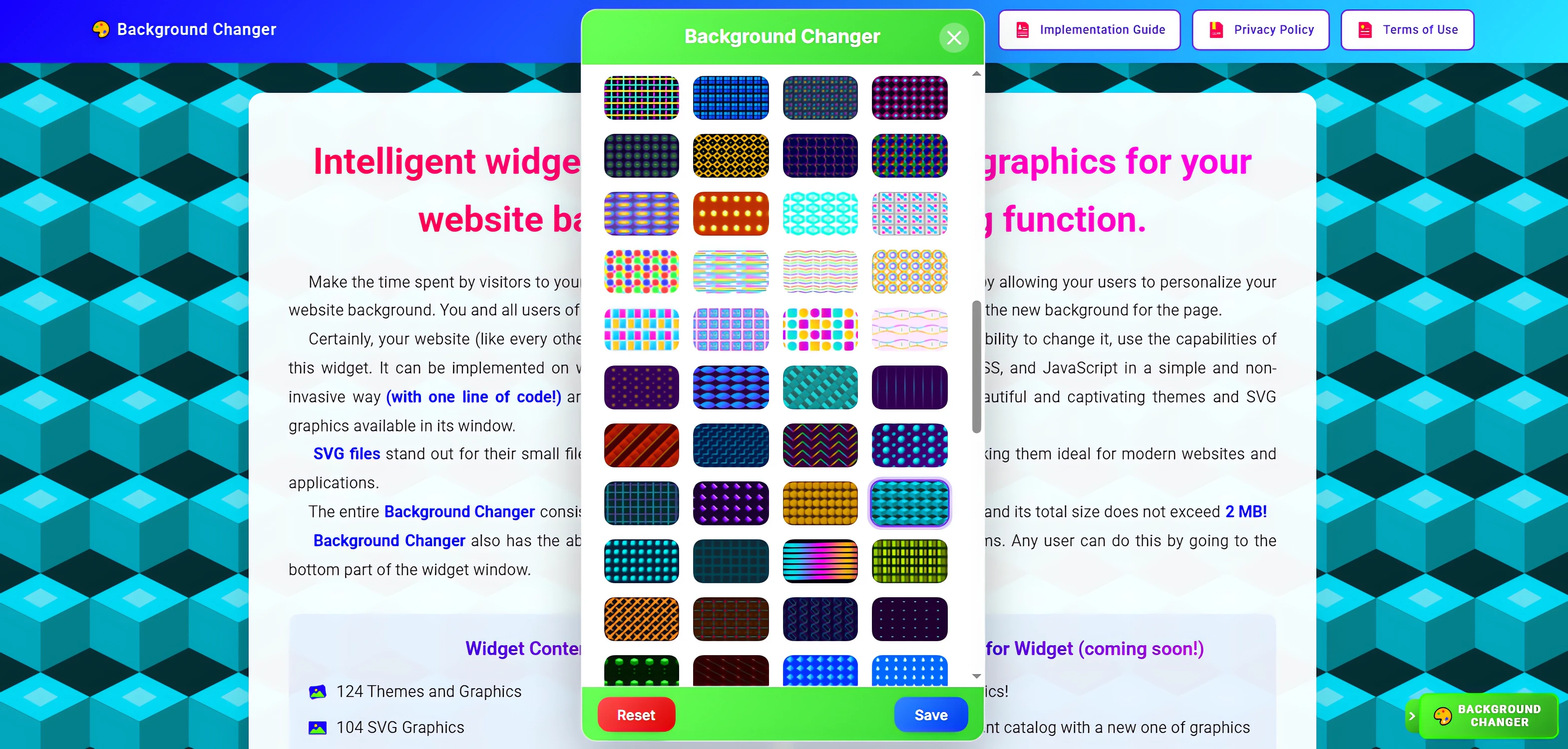 이 도구는 웹사이트 방문자가 104가지 SVG 그래픽과 20가지 그라데이션 테마를 포함한 124가지 배경을 기존 디자인 위에 설정할 수 있게 해주는 경량 위젯입니다. 단 한 줄의 코드로 설치하여 오버레이 모드, 투명도, 대비, 채도 및 속도를 제어할 수 있습니다. 22가지 스킨과 10가지 버튼 위치를 선택하고, 6가지 소셜 플랫폼으로 공유를 유도할 수 있습니다.