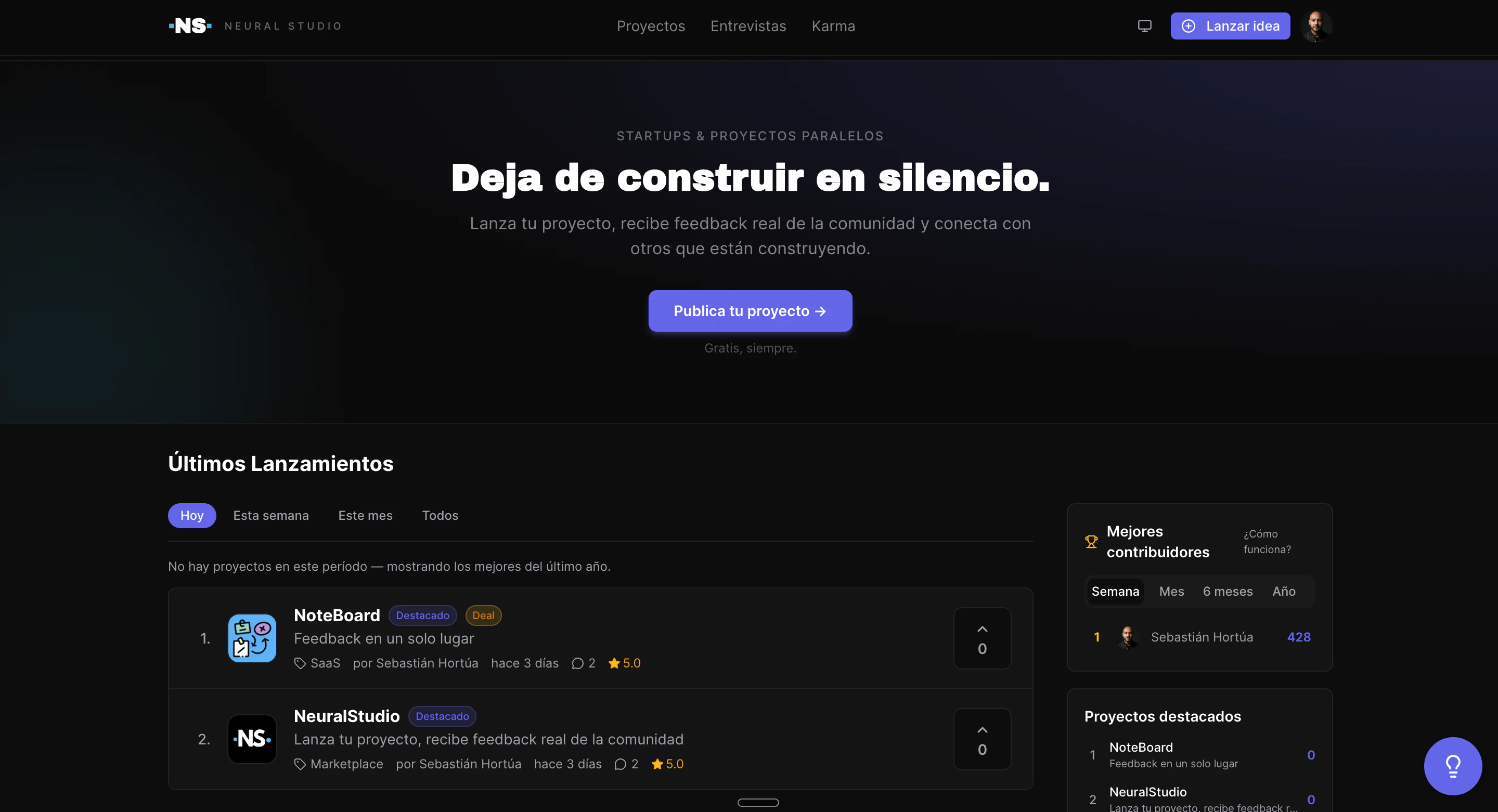 Neural Studio는 스페인어권 창업가들이 자신의 프로젝트를 세상에 선보이고, 커뮤니티로부터 솔직한 피드백을 받으며, 함께 만들어가는 사람들과 연결될 수 있도록 돕는 디렉토리입니다.