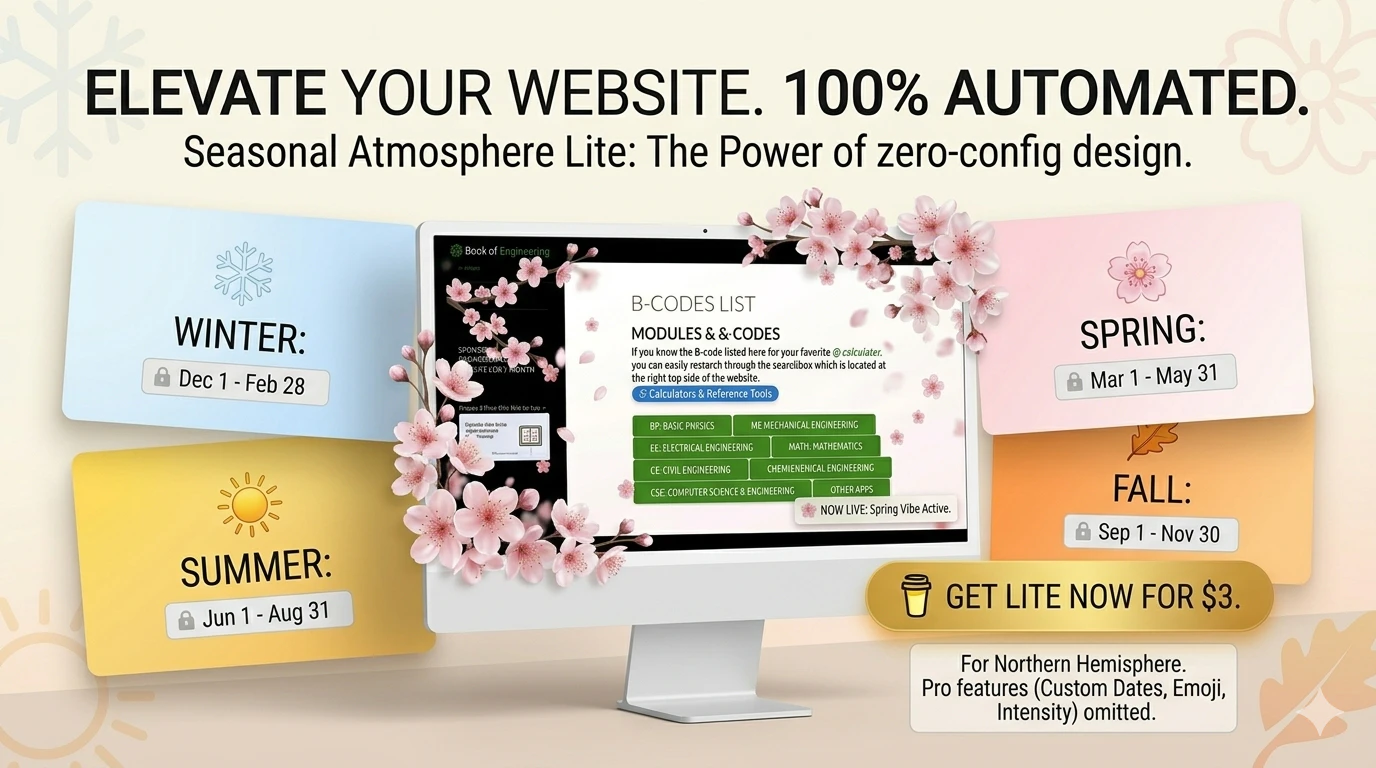 정적이고 지루한 웹사이트에 생동감을 불어넣으세요. 이 플러그인은 날짜를 감지하여 봄꽃, 여름 반짝임, 가을 낙엽, 겨울 눈 등 계절별 효과를 자동으로 활성화합니다. 복잡한 설정 없이 설치하고 활성화하기만 하면 웹사이트가 계절에 따라 변화하며, 미니멀하고 고성능이며 모바일 친화적인 경험을 제공합니다.