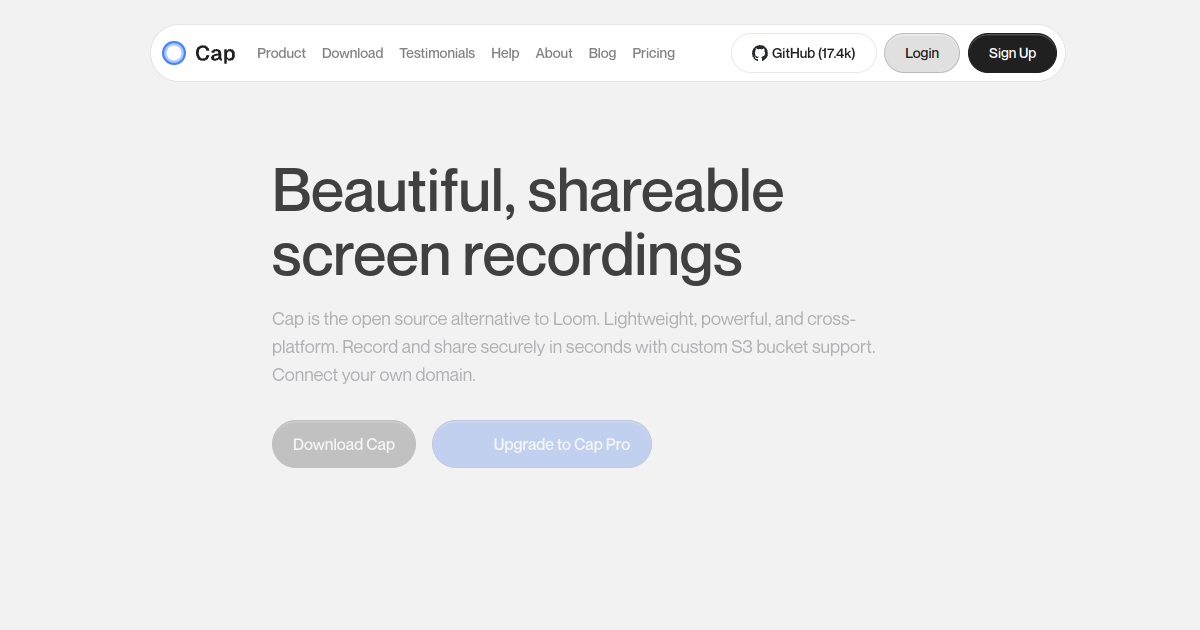 Cap은 Loom의 오픈소스 대안으로, 가볍고 강력하며 시각적으로 뛰어난 스크린 녹화 도구입니다. 몇 초 만에 안전하게 녹화하고 공유할 수 있으며, 사용자 지정 S3 버킷을 지원하여 녹화물의 소유권을 직접 가질 수 있습니다. 개발자와 메이커를 위해 설계되어, 빠르고 효율적인 워크플로우를 제공합니다.