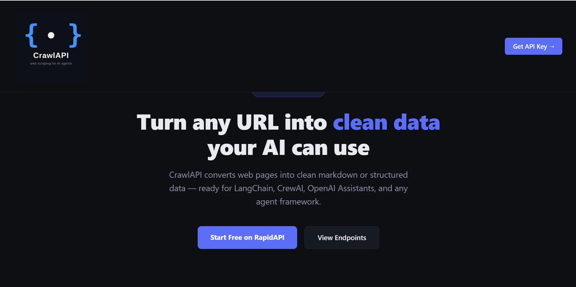 어떤 URL이든 깔끔한 마크다운과 구조화된 데이터로 변환하여 LLM 파이프라인, AI 에이전트 및 RAG 시스템에 최적화되었습니다. 단일 URL을 마크다운과 메타데이터로 변환하거나, 최대 10개의 URL을 병렬로 처리하며, 검색 쿼리를 통해 상위 결과를 스크래핑하는 기능을 제공합니다. OpenAPI 사양과 LangChain/CrewAI 도구 매니페스트를 포함하여 에이전트에 바로 통합할 수 있습니다.