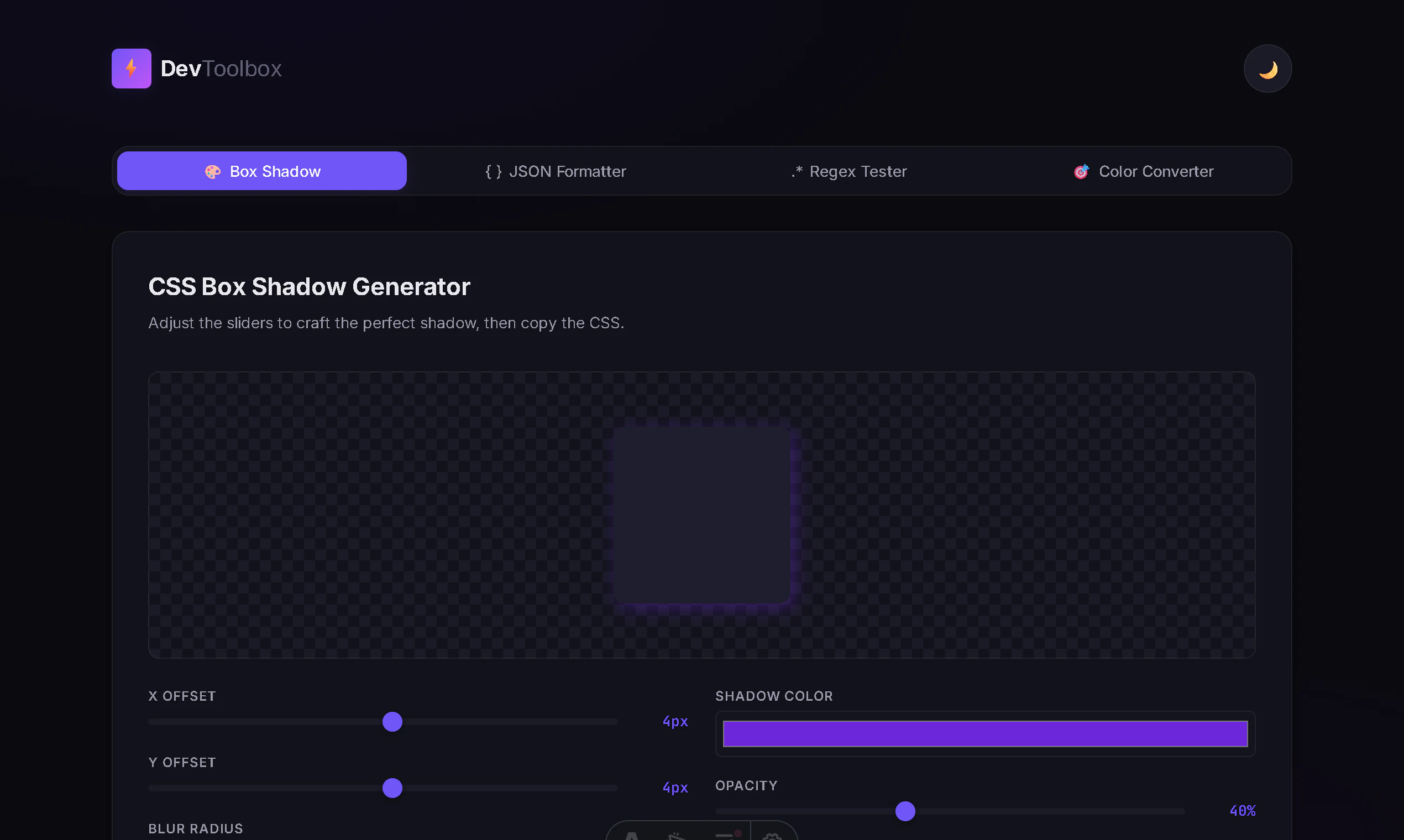 개발자라면 누구나 한 번쯤은 CSS 박스 섀도우를 만들거나, 복잡한 JSON 데이터를 보기 좋게 정리하고, 정규식 패턴을 테스트해야 할 때가 있습니다. Dev Toolbox는 이런 반복적이고 번거로운 작업들을 쉽고 빠르게 해결하도록 돕습니다. CSS 박스 섀도우 생성기, JSON 포맷터, 정규식 테스터, 색상 변환기 등 개발 과정에서 자주 사용하는 기능들을 모두 담았습니다.