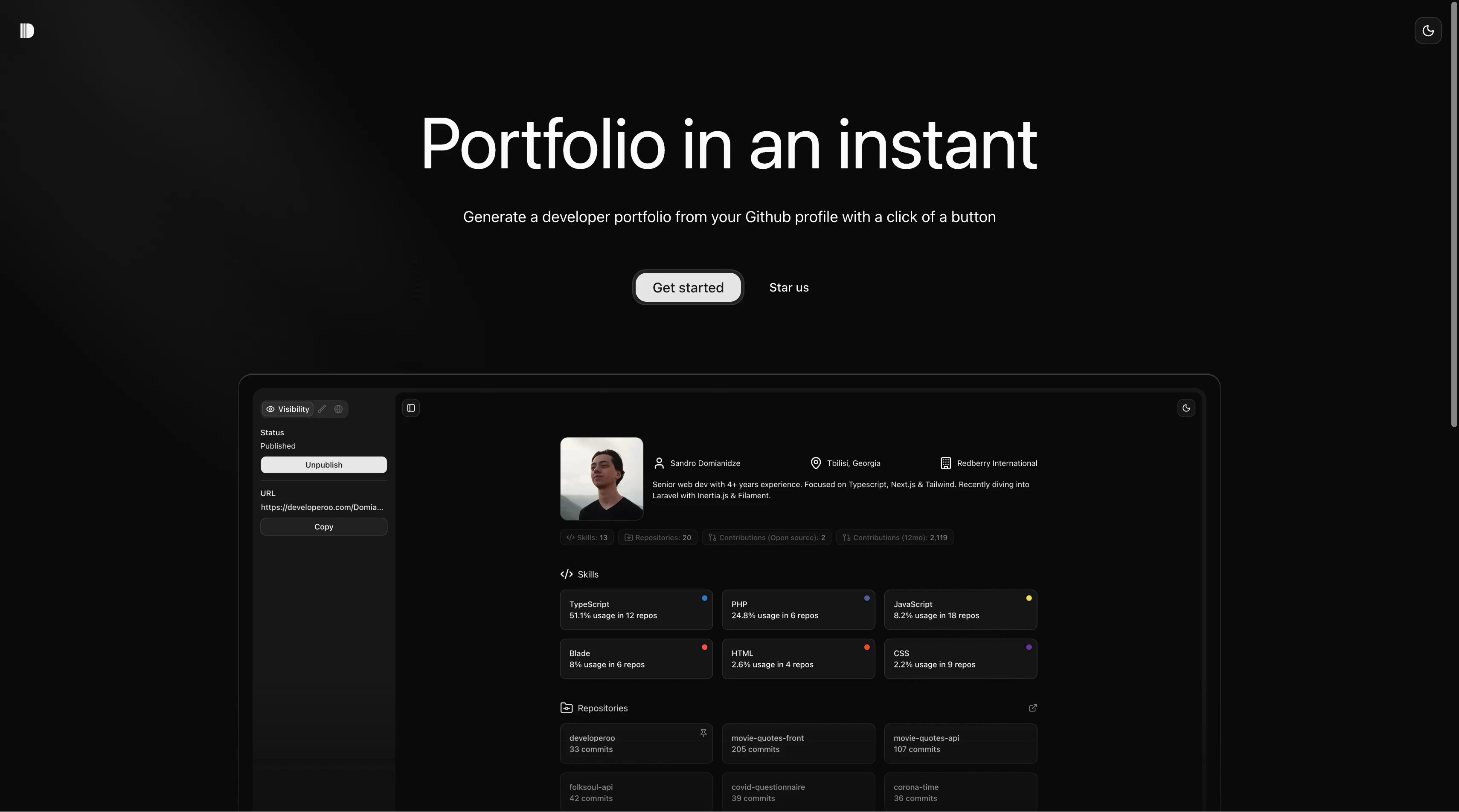 깃허브 활동만으로 나만의 개발자 포트폴리오를 순식간에 만들고 싶다면, Developeroo를 써보세요. 깃허브 데이터를 기반으로 깔끔한 포트폴리오를 자동으로 완성해 줍니다.
