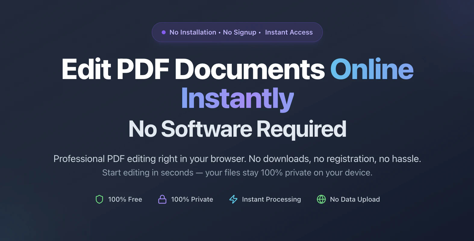 소프트웨어 설치나 계정 생성 없이 PDF 문서를 즉시 온라인에서 편집할 수 있습니다. 브라우저에서 빠르고 강력한 PDF 편집 기능을 제공하며, 다운로드나 가입 없이 100% 무료로 개인 정보를 보호하며 사용할 수 있습니다.