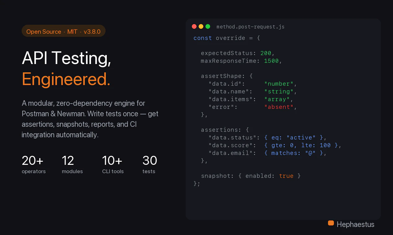 흩어져 있던 Postman의 요청 전/후 스크립트를 단일 버전 관리 엔진으로 대체하는 오픈소스 프레임워크입니다. 각 요청은 작은 오버라이드 설정만 포함하며, 엔진이 20개 이상의 어설션 연산자, 스냅샷 회귀, JSON 스키마, OAuth2, 비밀 마스킹, 재시도 등 모든 것을 처리합니다. HTML 보고서, JUnit XML, 실행 비교, 감시 모드, 문서 생성기, Docker 지원 등 10개 이상의 CLI 도구를 제공하며, npm 종속성이 없습니다.