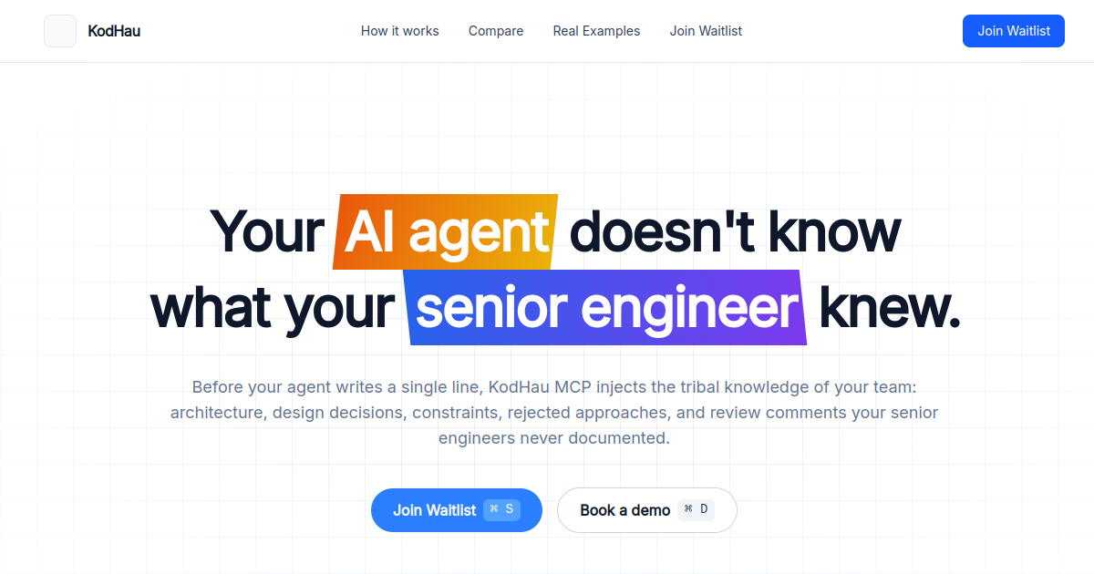 귀하의 에이전트가 단 한 줄의 코드를 작성하기 전에, KodHau MCP는 귀하의 개발 팀의 부족 지식 — 아키텍처 결정, 제약 사항, 거부된 접근 방식, 그리고 문서화되지 않은 검토 의견 — 을 주입합니다. 우리는 가장 복잡한 리포 중 하나인 dotnet/runtime 리포에서 테스트했습니다. Cursor 단독으로는 "네, 삭제해도 됩니다."라고 말했습니다. KodHau와 함께한 Cursor는 그것이 프로덕션을 망가뜨릴 정확한 이유를 설명하는 3개의 PR을 찾아냈습니다. 하나의 도구. 로컬에서 실행됩니다. 귀하의 코드는 귀하의 머신을 떠나지 않습니다.