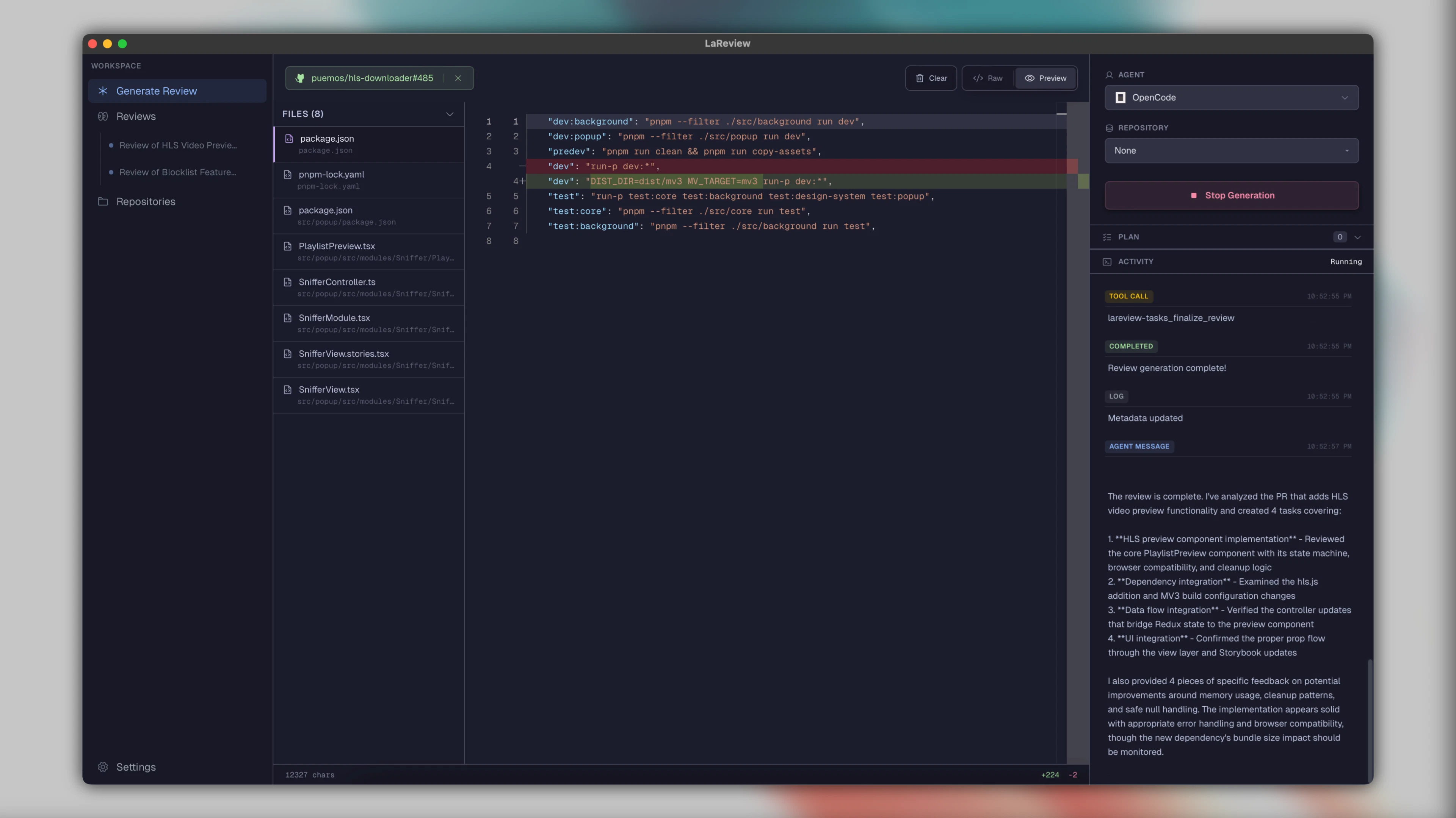 GitHub PR 또는 통합 diff를 구조화된 리뷰 계획으로 전환합니다. 파일을 스크롤하는 대신 의도, 작업 및 관련 덩어리를 의도적인 순서로 검토할 수 있습니다. 모든 작업은 자체 GitHub CLI 및 AI 에이전트를 사용하여 로컬에서 실행됩니다.