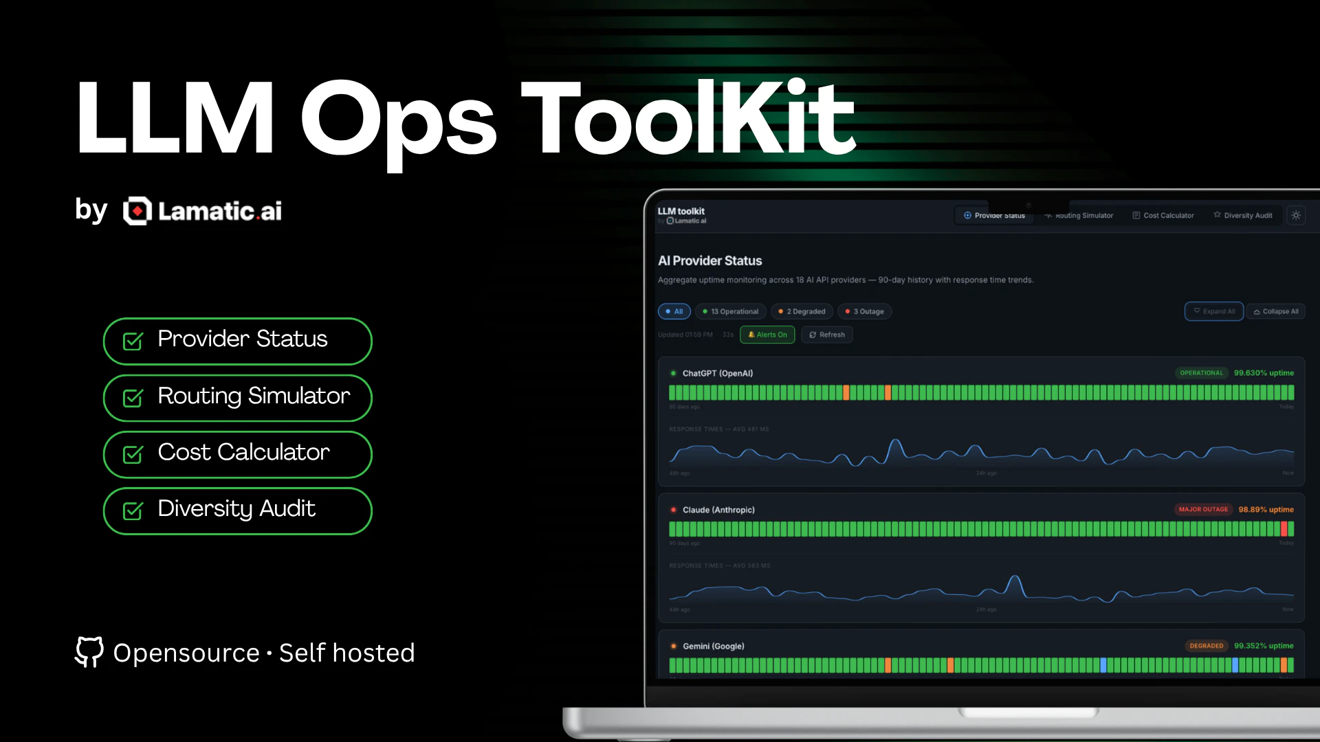 프로덕션 환경에서 20개 이상의 LLM API를 관리하는 데 필요한 대화형 도구들을 제공합니다. 비용 계산기, 다양성 감사, 라우팅 시뮬레이터 등을 통해 LLM 운영의 복잡성을 해결하고 효율성을 높입니다.