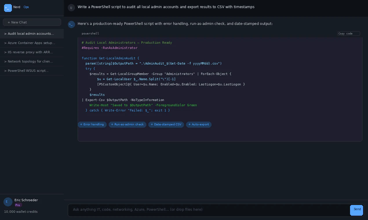 로그 파일을 입력하면 정확한 진단을 받을 수 있고, 필요한 PowerShell 스크립트를 요청하면 실제로 작동하는 스크립트를 얻을 수 있습니다. Azure, Active Directory, IIS, 네트워킹 등 다양한 IT 분야에 대한 전문 지식을 갖추고 있어 복잡한 IT 환경에서도 막힘없이 업무를 처리하도록 돕습니다.