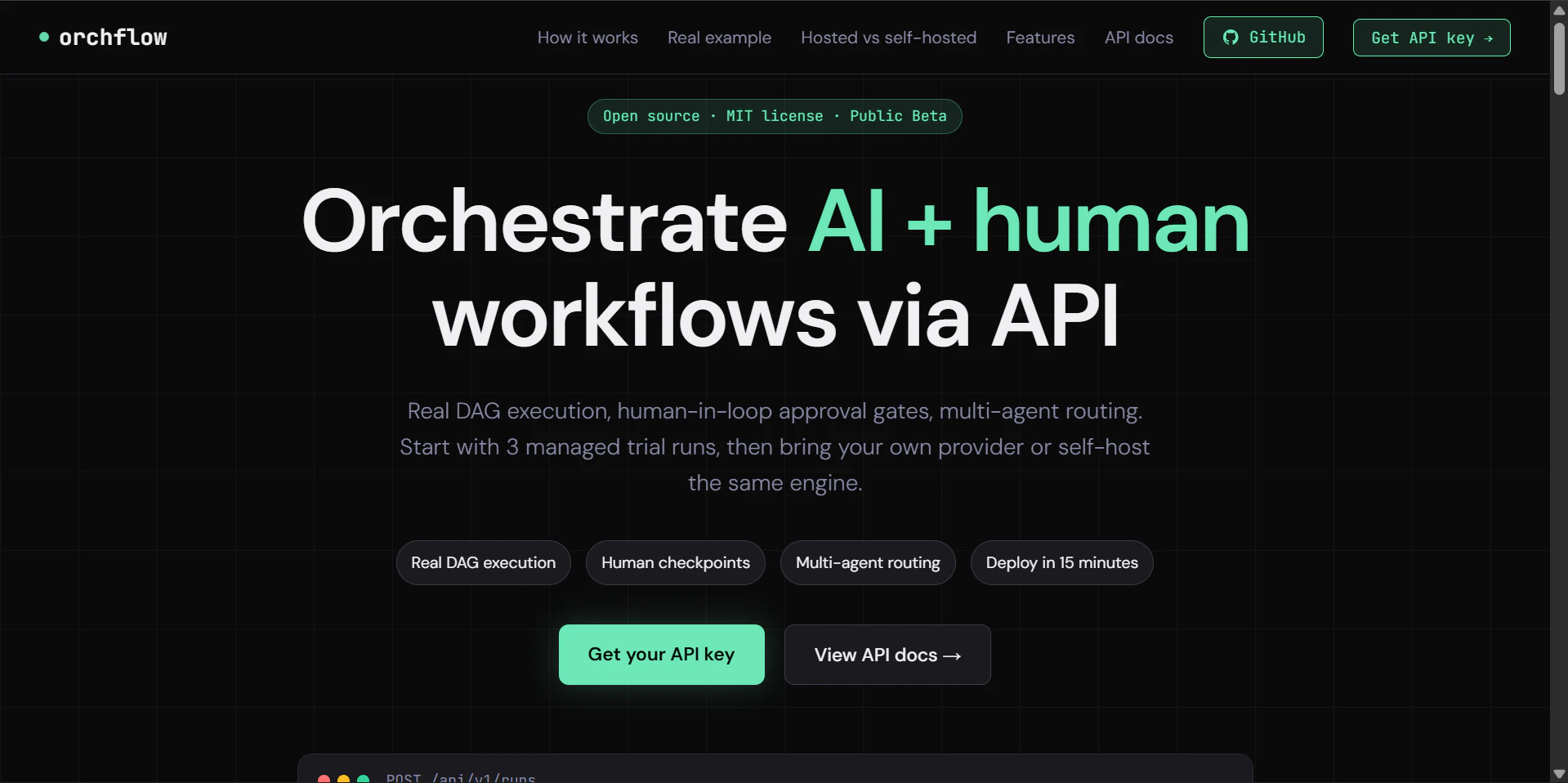 목표를 POST하면 이를 작업으로 분할하고, 실제 의존성 그래프를 구축하여 AI 에이전트로 라우팅합니다. 사용자의 승인을 위해 일시 중지되었다가 자동으로 재개됩니다. 워크플로우 인프라를 반복적으로 구축할 필요가 없습니다.