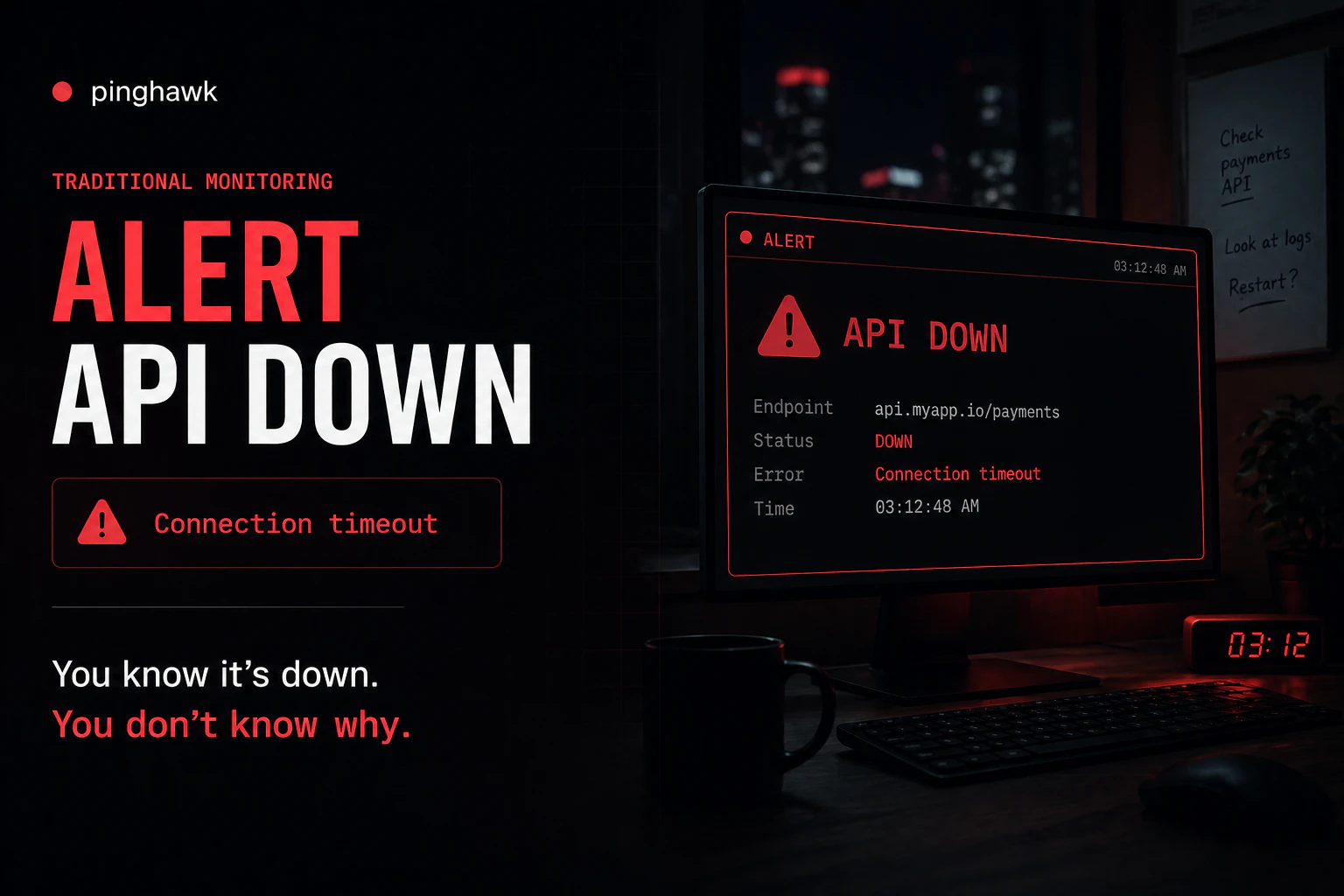 API 오류가 발생했을 때, 그 원인을 정확히 파악하도록 돕는 Pinghawk입니다. 개발자라면 누구나 겪는 API 장애 문제 해결에 집중했습니다.