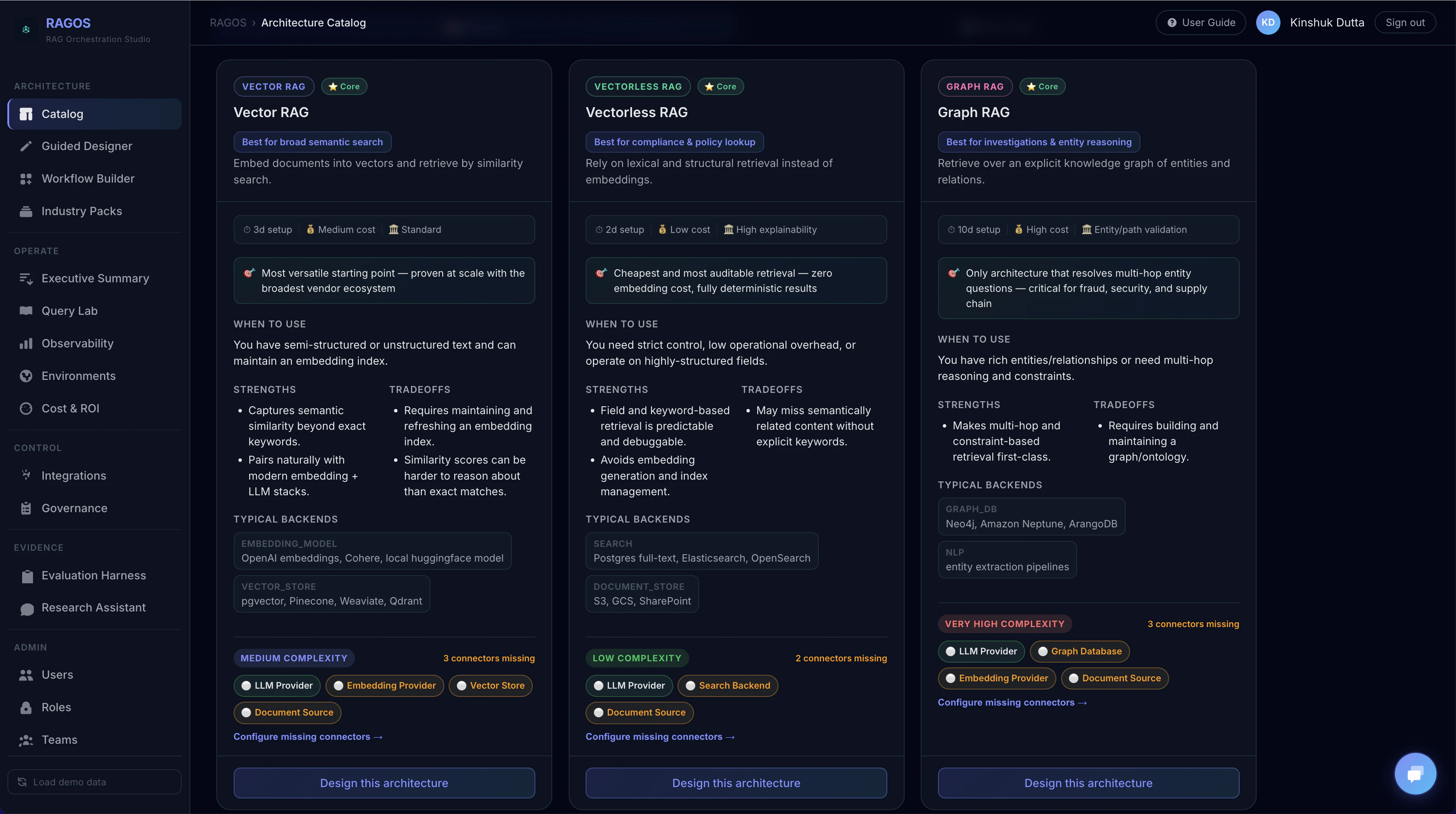 검색 아키텍처를 탐색하고 설계하기 위한 브라우저 기반 환경입니다. 팀이 벡터, 그래프, 하이브리드 및 벡터 없는 RAG 패턴을 비교하고, 워크플로우를 시각적으로 설계하며, 구현에 착수하기 전에 장단점을 고려하도록 돕습니다. RAG를 단순히 벡터 데이터베이스 패턴이 아닌 아키텍처 문제로 다루고자 하는 실무자를 위해 제작되었습니다.
