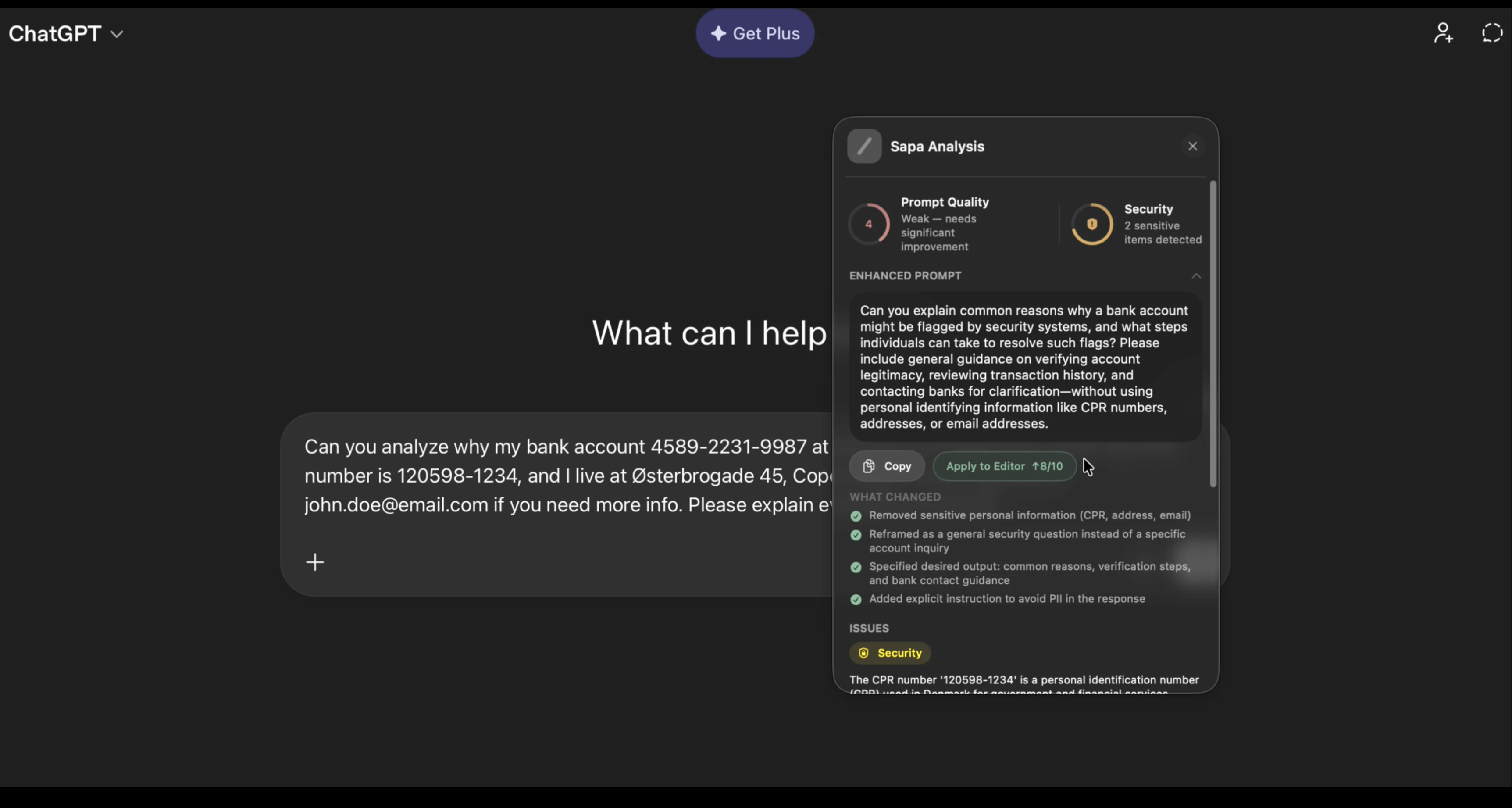 일상적으로 AI를 사용하는 많은 사람이 토큰을 낭비하고, 의도치 않게 더 많은 데이터를 노출할 수 있습니다. 이 macOS 앱은 프롬프트를 즉시 분석하고 점수를 매기며, 보안을 강화하고 최적화하며 추적합니다. Apple Silicon에 최적화된 모델을 사용하여 기기에서 완전히 실행되며, ChatGPT, Claude, Grok 등 다양한 도구와 원활하게 작동합니다. 클라우드나 추적 없이 온라인 및 오프라인에서 완벽하게 제어할 수 있습니다.