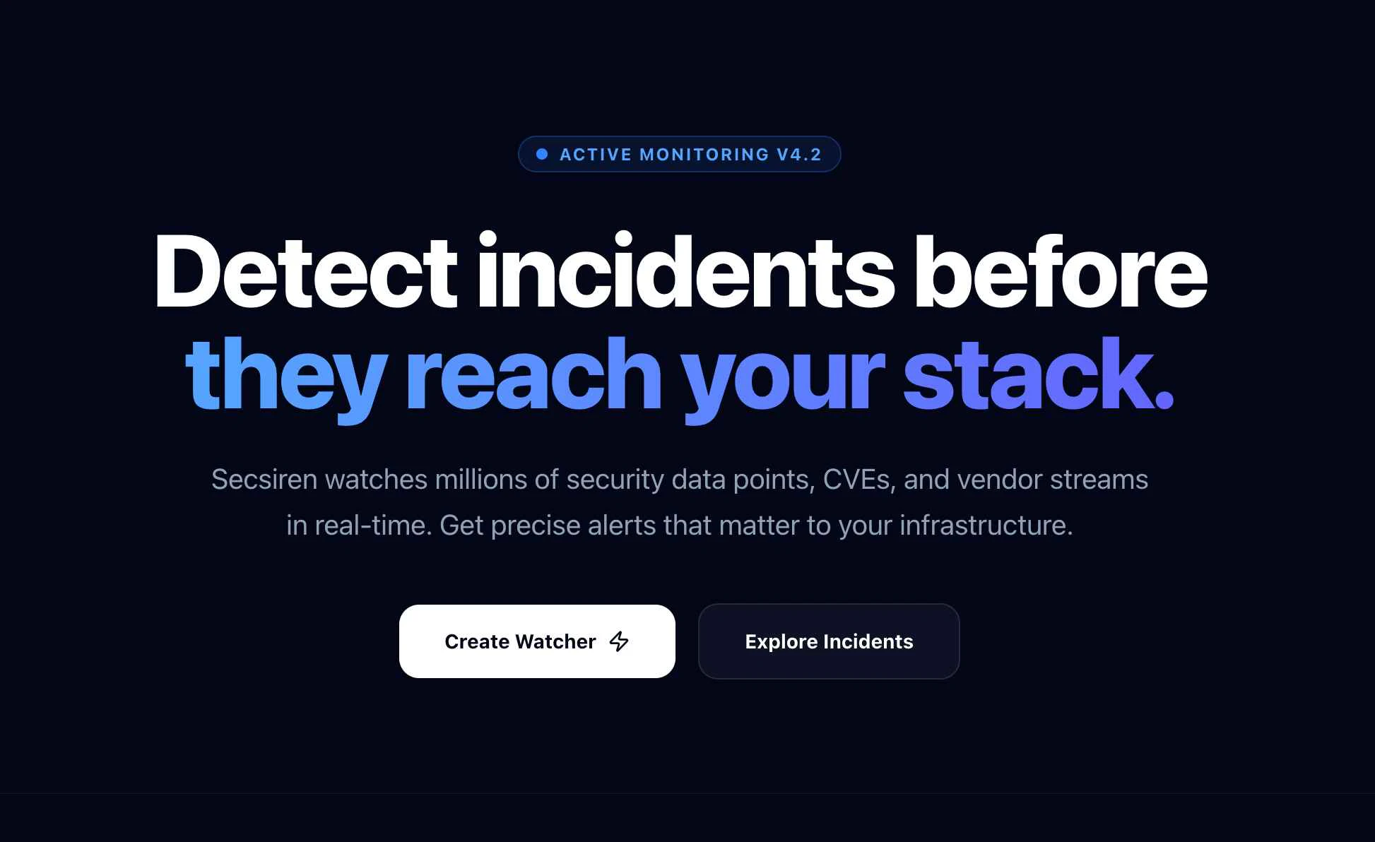 CVE, 벤더 권고, 제로데이 취약점을 실시간으로 모니터링하여 시스템에 영향을 미치기 전에 알려줍니다. 대부분의 도구가 사고 발생 후에 문제를 보여주는 반면, SecSiren은 초기 신호에 집중하여 피해, 다운타임 또는 침해가 발생하기 전에 조치할 수 있도록 돕습니다. 이메일, SMS 또는 전화를 통해 스택에 맞춰진 정확하고 실행 가능한 알림을 받을 수 있어, 빠르게 개발하고 늦은 알림을 감당할 수 없는 개발자와 소규모 팀에 최적화되어 있습니다.