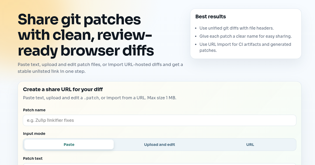 SharePatch는 깃(git) 패치를 깔끔하고 공유하기 쉬운 링크로 바꿔주는 서비스예요. 복잡한 터미널 명령어 없이도, 패치 내용을 웹에서 바로 옆으로 나란히 보면서 빠르게 검토할 수 있죠. 텍스트를 붙여넣거나, 패치 파일을 올리거나, URL에 있는 diff를 가져오기만 하면 끝! 안정적인 비공개 링크가 바로 생성돼요. 언제 어디서든 팀원들과 코드 변경 사항을 효율적으로 공유하고 피드백을 주고받을 수 있어서 개발 워크플로우를 훨씬 매끄럽게 만들어 줄 거예요.