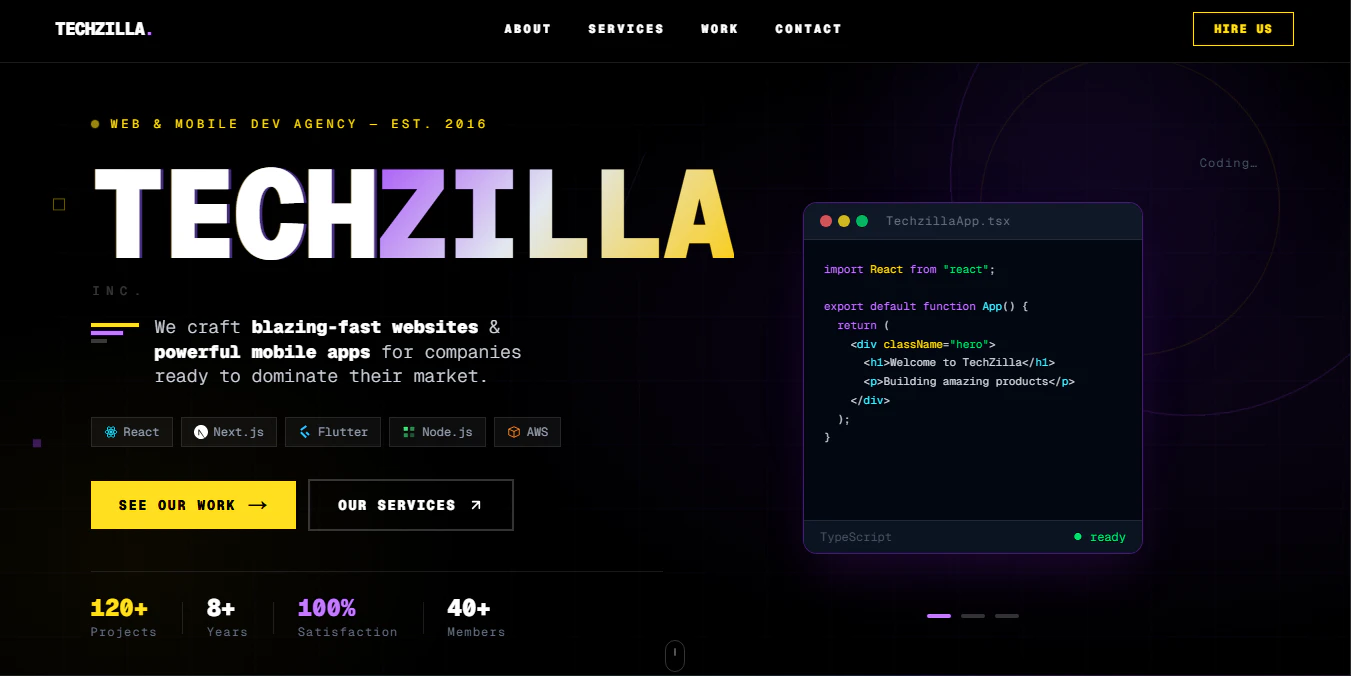 Techzilla Inc.는 최신 웹사이트, 모바일 앱, 그리고 확장 가능한 소프트웨어 솔루션을 만드는 데 특화되어 있습니다. UI/UX 디자인부터 백엔드 시스템 구축, 풀스택 개발까지 아우르며, 스타트업과 기업들이 필요로 하는 기술적 솔루션을 제공합니다.