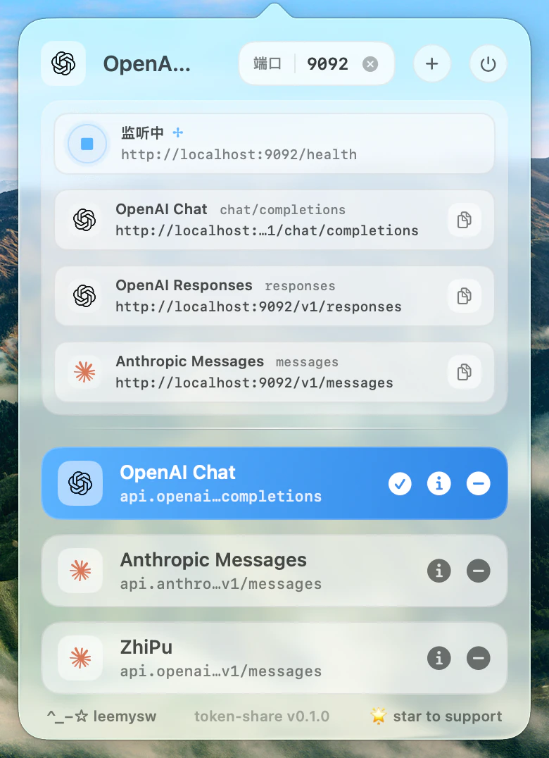 macOS 메뉴 막대에서 LLM API를 관리합니다. OpenAI Chat Completions, OpenAI Responses, Anthropic Messages 프로토콜 간의 변환 및 스트리밍을 로컬에서 지원하여 개발 편의성을 높입니다.