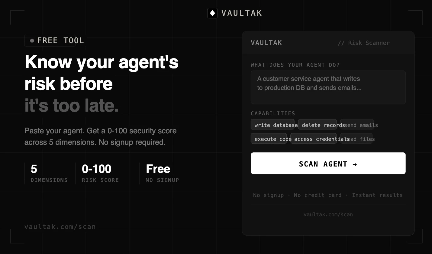 매일 20만 개 이상의 AI 에이전트가 배포되지만, 보안 테스트를 거치는 경우는 거의 없습니다. Vaultak은 개발자에게 무료 AI 에이전트 위험 스캐너를 제공하여, 에이전트를 설명하면 5가지 차원에 걸쳐 0-100점의 보안 점수를 즉시 받을 수 있습니다. 가입이나 신용카드 정보 없이 복합 위험 점수, 5가지 차원별 분석, 정책 권장 사항을 얻고 원클릭으로 공유할 수 있습니다.