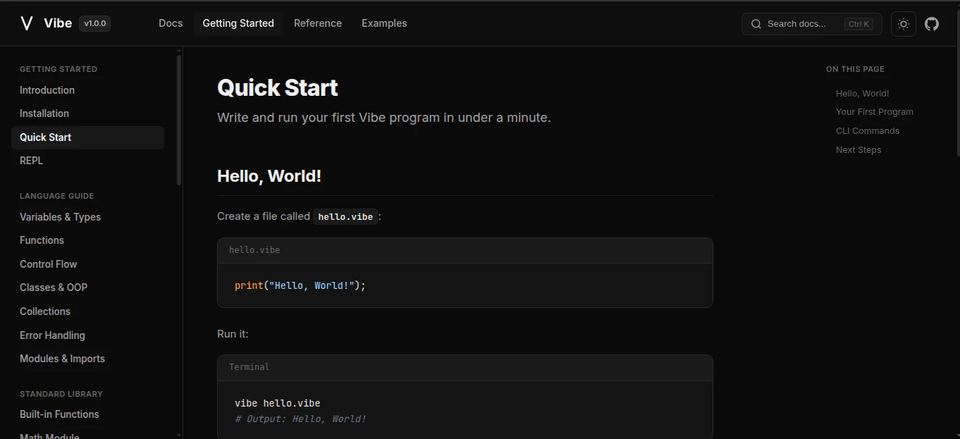 Vibe는 복잡성을 줄이고 개발 속도를 높이는 데 집중한 현대적인 프로그래밍 언어입니다. 파이썬에서 영감을 받은 간결하고 읽기 쉬운 문법을 채택하면서도, C언어에 버금가는 효율성을 제공합니다. 이를 통해 개발자는 더욱 명확하고 강력한 코드를 더 빠르게 작성할 수 있습니다.