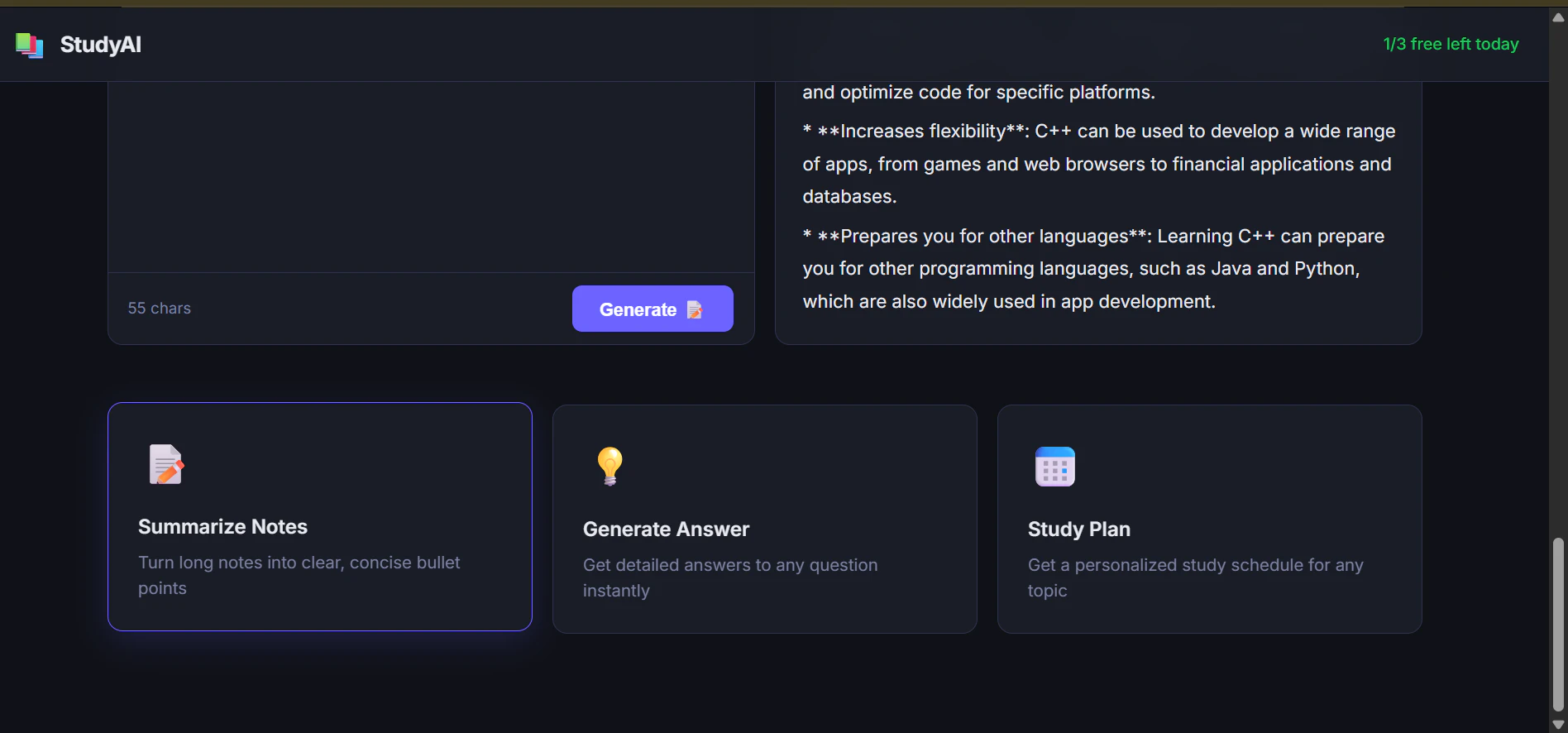 AI를 활용하여 학생들이 더 빠르게 학습하도록 돕습니다. 노트를 붙여넣거나 질문하면 몇 초 만에 즉시 결과를 얻을 수 있습니다. 긴 노트를 명확한 요점으로 요약하고, 어떤 질문에도 상세한 답변을 생성하며, 모든 주제에 대한 맞춤형 학습 계획을 제공합니다. 매일 3회 무료로 이용 가능하며, 프리미엄으로 업그레이드하면 무제한으로 사용할 수 있습니다.