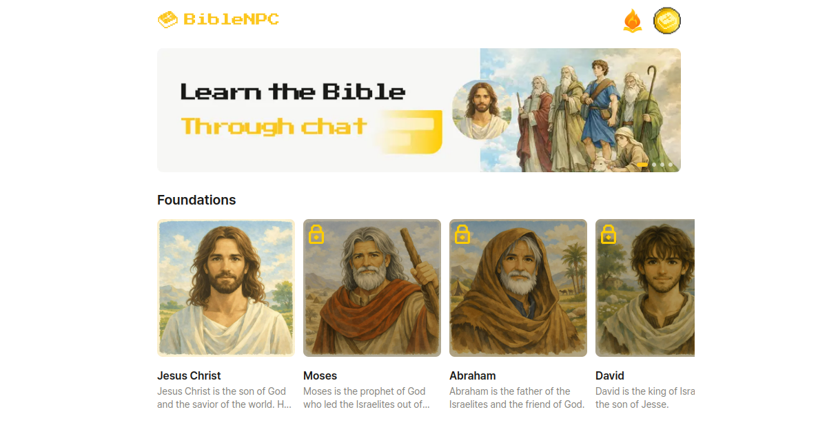 AI 성경 인물들과 대화하며 성경을 학습하는 앱입니다. 각 인물은 특정 구절과 관련된 핵심 질문으로 구성된 학습 경로를 제공하며, 모든 레슨에는 이미지가 포함되어 있습니다. 듀오링고 방식의 연속 학습과 진행 상황 추적을 통해 성경 읽기를 매일의 대화로 바꾸어 완독을 돕습니다.
