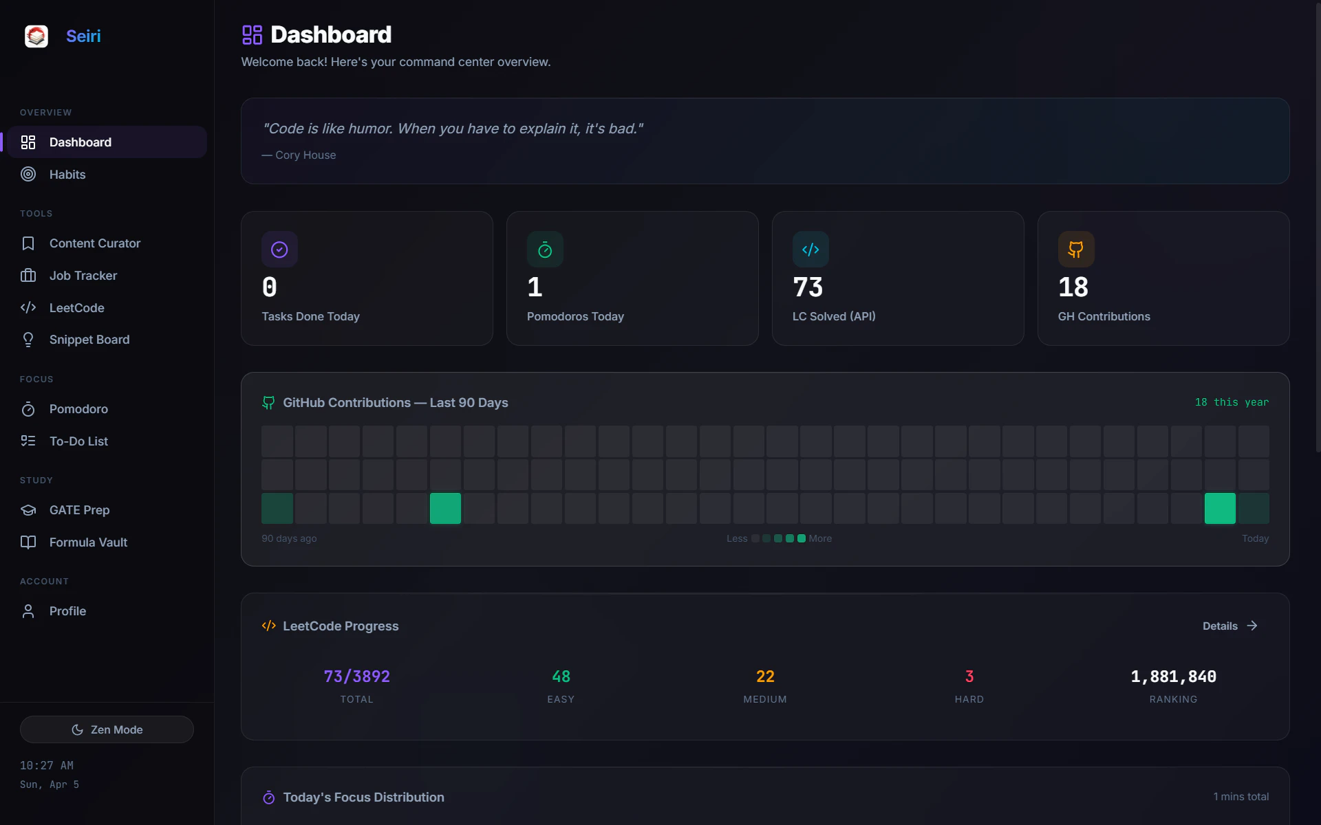 GATE 준비, 코딩(DSA/LeetCode), 취업 준비를 병행하는 학생들을 위한 통합 생산성 대시보드입니다. 강의 진도 추적, 공식 관리, 뽀모도로를 활용한 집중 업무 기록, 코딩 일관성 모니터링, 지원서 정리 등 모든 것을 한곳에서 할 수 있습니다. 여러 도구를 오가는 번거로움을 줄이고 집중력을 높이도록 설계되었습니다. 저와 같은 길을 걷는 분들을 위해 공유합니다. 🚀