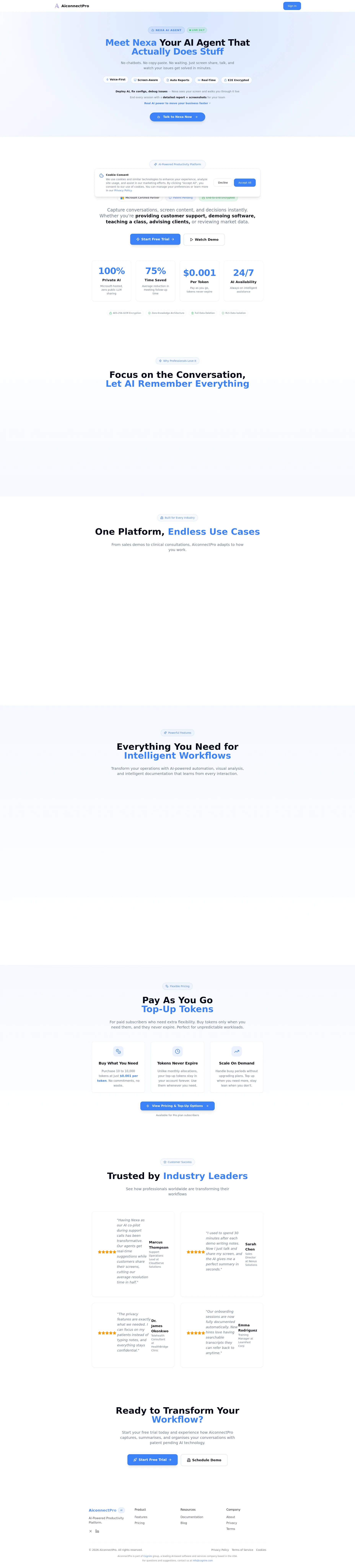 화면을 공유하고 Nexa와 대화하며 즉석 요약, PDF 보고서, 그리고 Jira, Notion, Asana, Zendesk 등으로 자동 생성된 티켓을 받아보세요. 실시간 음성 및 화면 분석, OCR, 자동 스크린샷 기능을 제공합니다. AES-256-GCM 암호화 및 Microsoft 호스팅으로 보안을 강화하며, 통화 후 문서화 시간을 75% 절감합니다. 지원, 영업, 의료, 법률, 금융 분야에 적합하며 Microsoft 공인 파트너입니다.