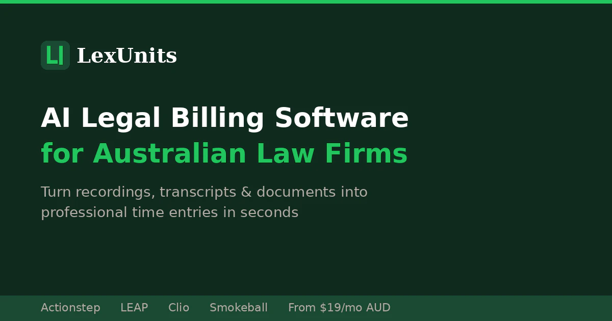 회의 녹음, 녹취록, 이메일, 문서를 전문적인 시간 청구 항목으로 즉시 변환합니다. Actionstep, LEAP, Clio, Smokeball로 내보낼 수 있습니다. 서신 초안 작성, 문서 요약, 판례 검색, 회의록 생성 등 AI 법률 도구가 포함되어 있어 호주 변호사에게 최적화된 솔루션입니다.
