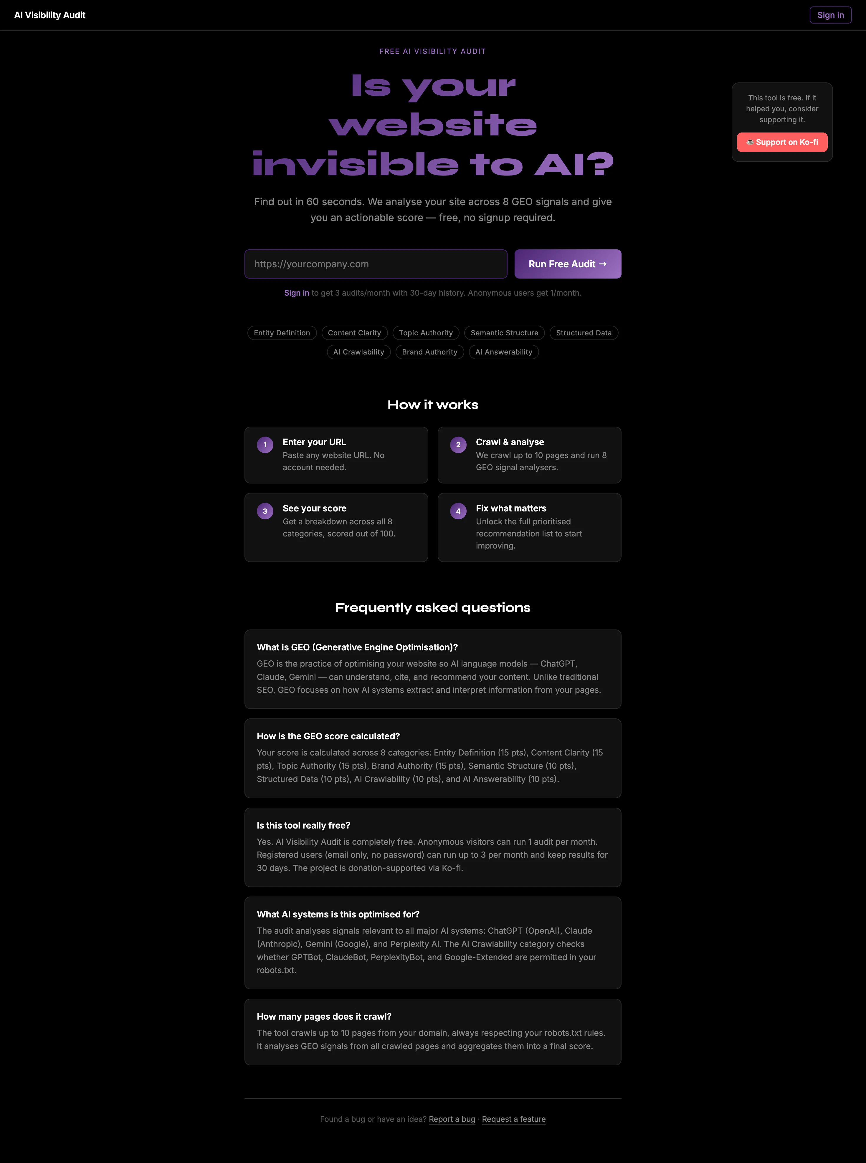 - ●AI Visibility Audit은(는) 마케팅/콘텐츠 카테고리에서 탐색되는 도구입니다.