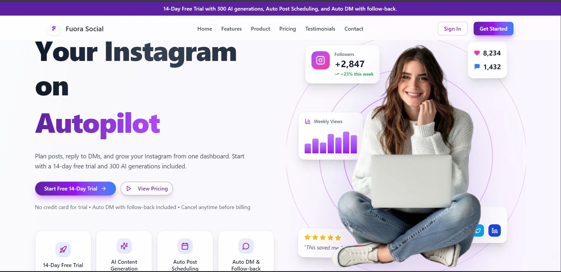 콘텐츠 생성, 자동 게시, DM 발송을 지원하며, 심층 분석을 통해 인스타그램 팔로워를 늘리는 데 도움을 줍니다. AI 기반 플랫폼으로 인스타그램 활동을 극대화할 수 있습니다.