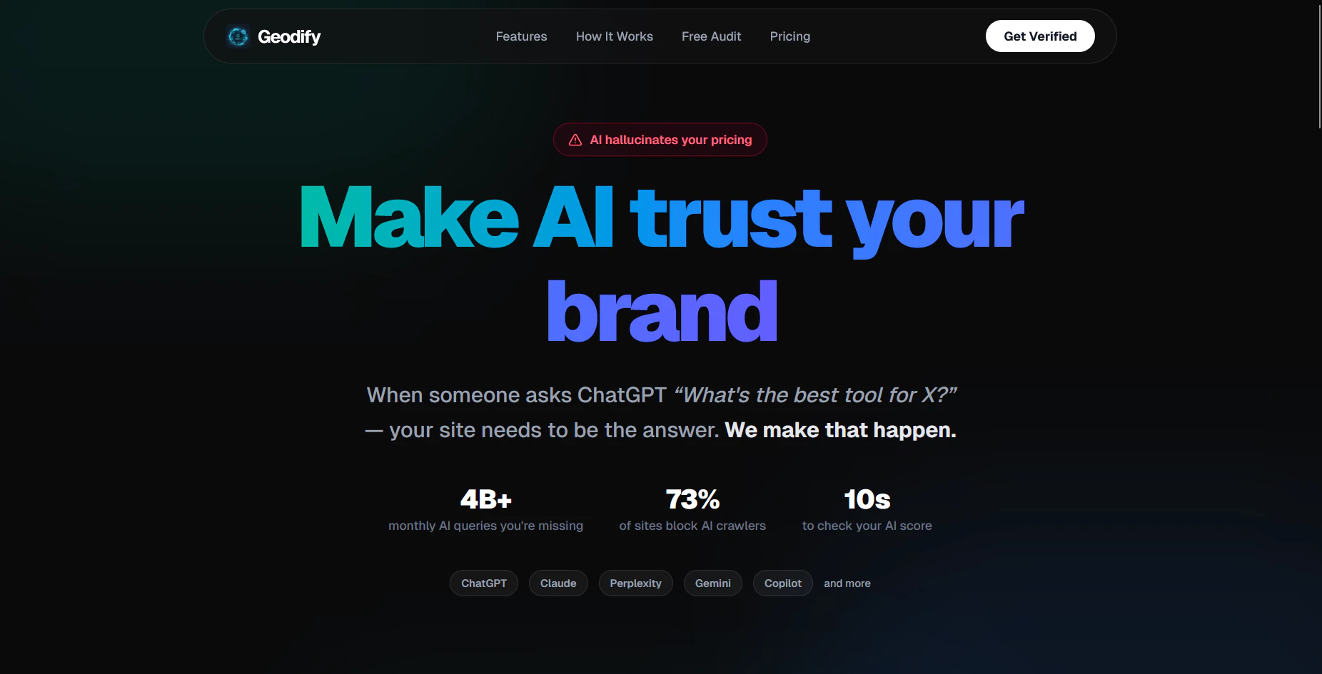 웹사이트를 AI가 기본적으로 읽을 수 있도록 최적화합니다. ChatGPT, Claude, Perplexity 등 주요 AI 모델에서의 가시성을 감사하고, 필요한 파일, 태그, 구조화된 데이터를 제공하여 개선을 돕습니다. 10초 만에 무료 감사를 받아보세요.
