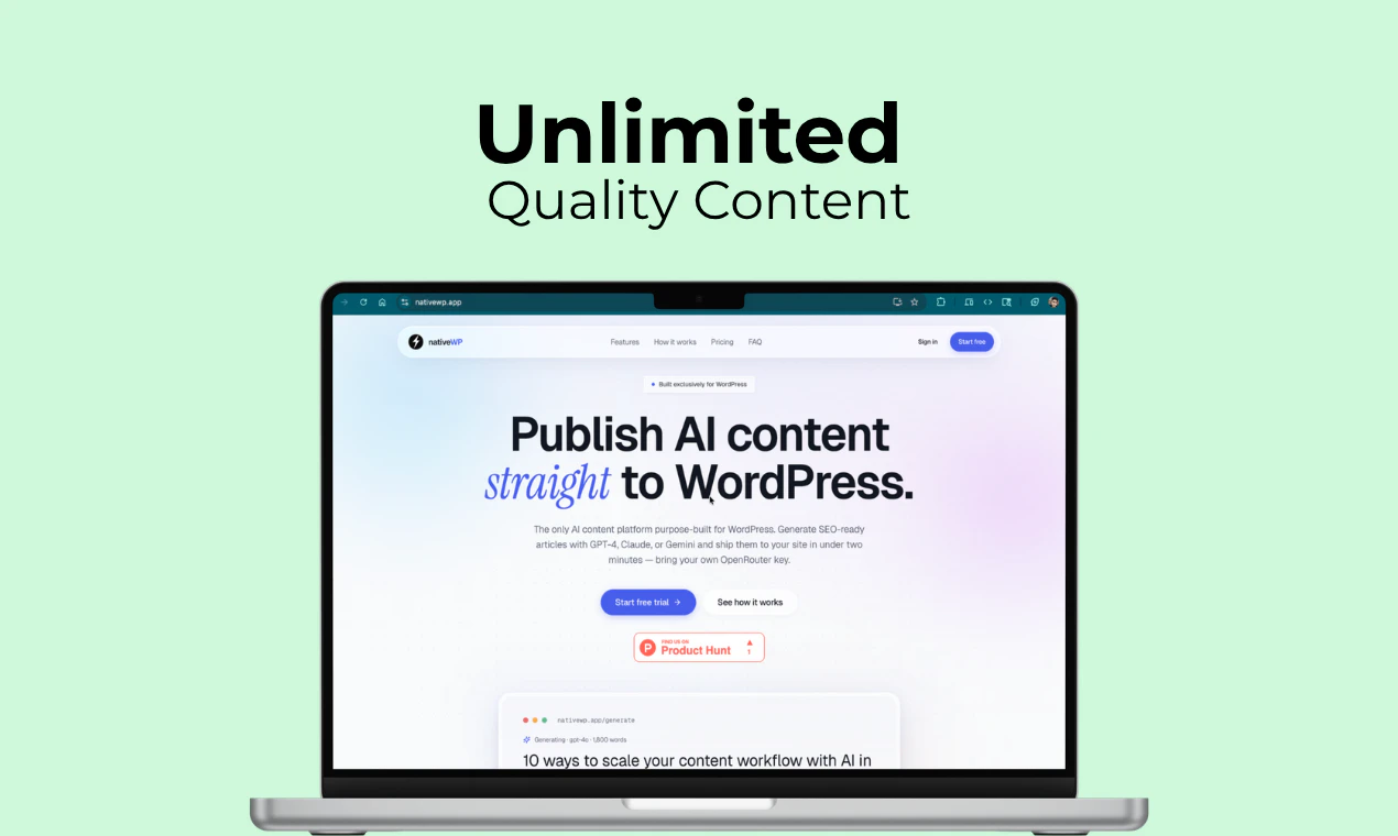 워드프레스 콘텐츠 제작에 어려움을 겪고 있다면, nativeWP가 해결책이 될 수 있습니다. 이 도구는 AI를 활용해 SEO에 딱 맞는 기사를 자동으로 생성하고, 워드프레스에 바로 게시해 줍니다. 복잡한 과정 없이 몇 분 만에 대량의 콘텐츠를 만들고 발행 예약까지 할 수 있어, 콘텐츠 생산성을 획기적으로 높여줍니다.