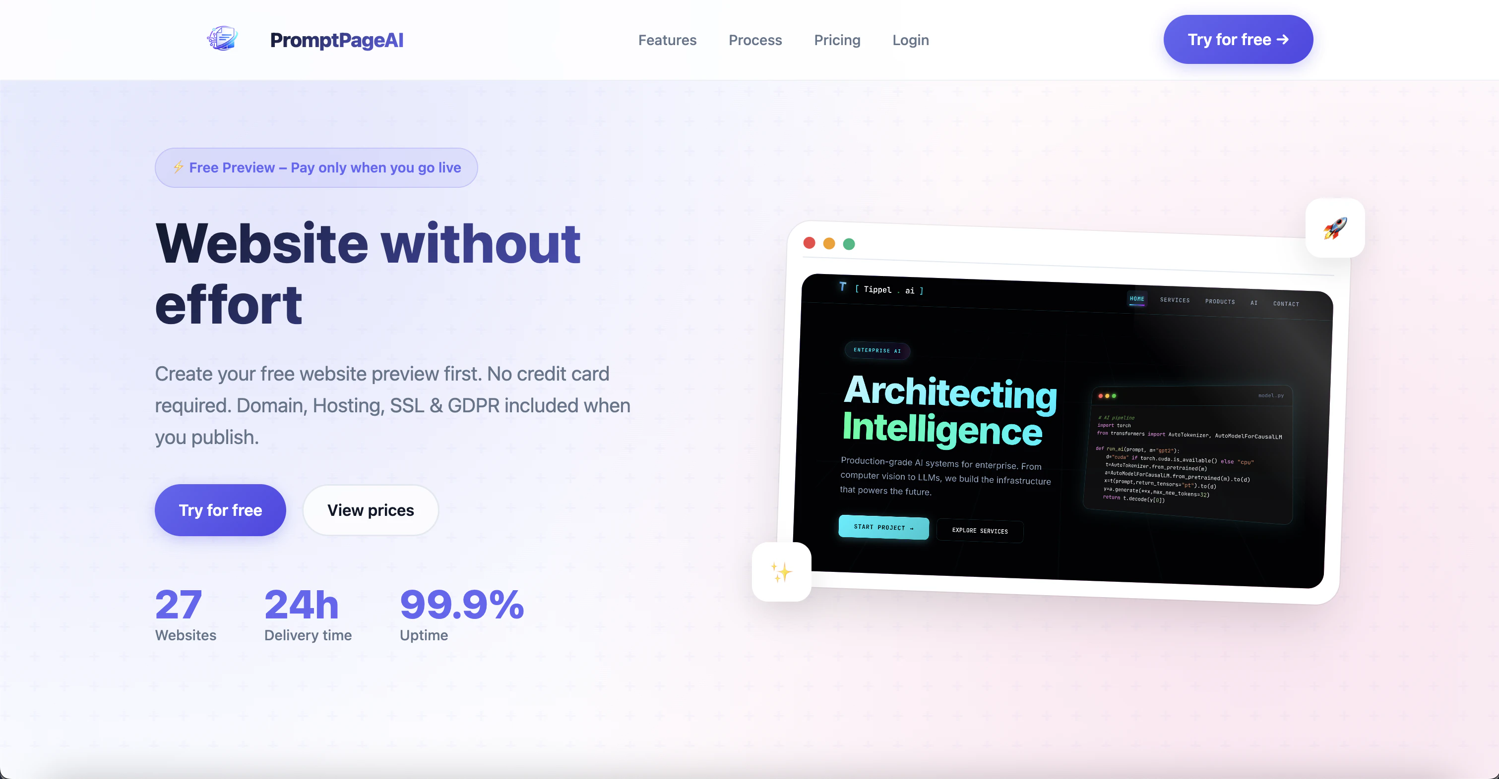 PromptPageAI를 이용하면 호스팅, 도메인, SSL 보안, 모바일 최적화, SEO까지 모두 포함된 완성도 높은 웹사이트를 단 24시간 안에 받아볼 수 있습니다. 온라인에서 빠르게 존재감을 드러내고 싶거나, 복잡한 웹사이트 제작 과정에 지친 분들에게 최고의 선택이 될 것입니다.