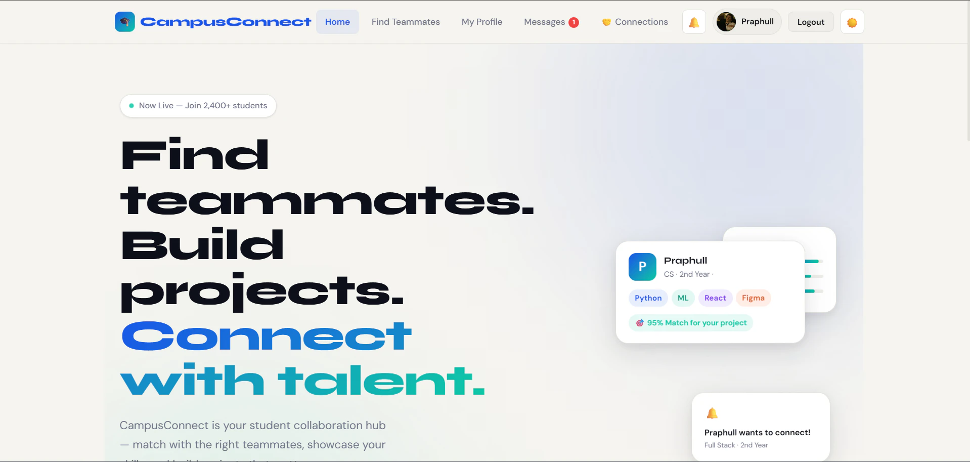 팀원 찾기는 항상 어렵습니다. 다른 사람들의 기술을 정확히 알기 어렵기 때문입니다. CampusConnect는 기술과 관심사를 기반으로 학생들을 발견하고, 깔끔한 프로필과 실시간 메시징을 통해 팀 빌딩을 간소화하는 데 유용합니다.