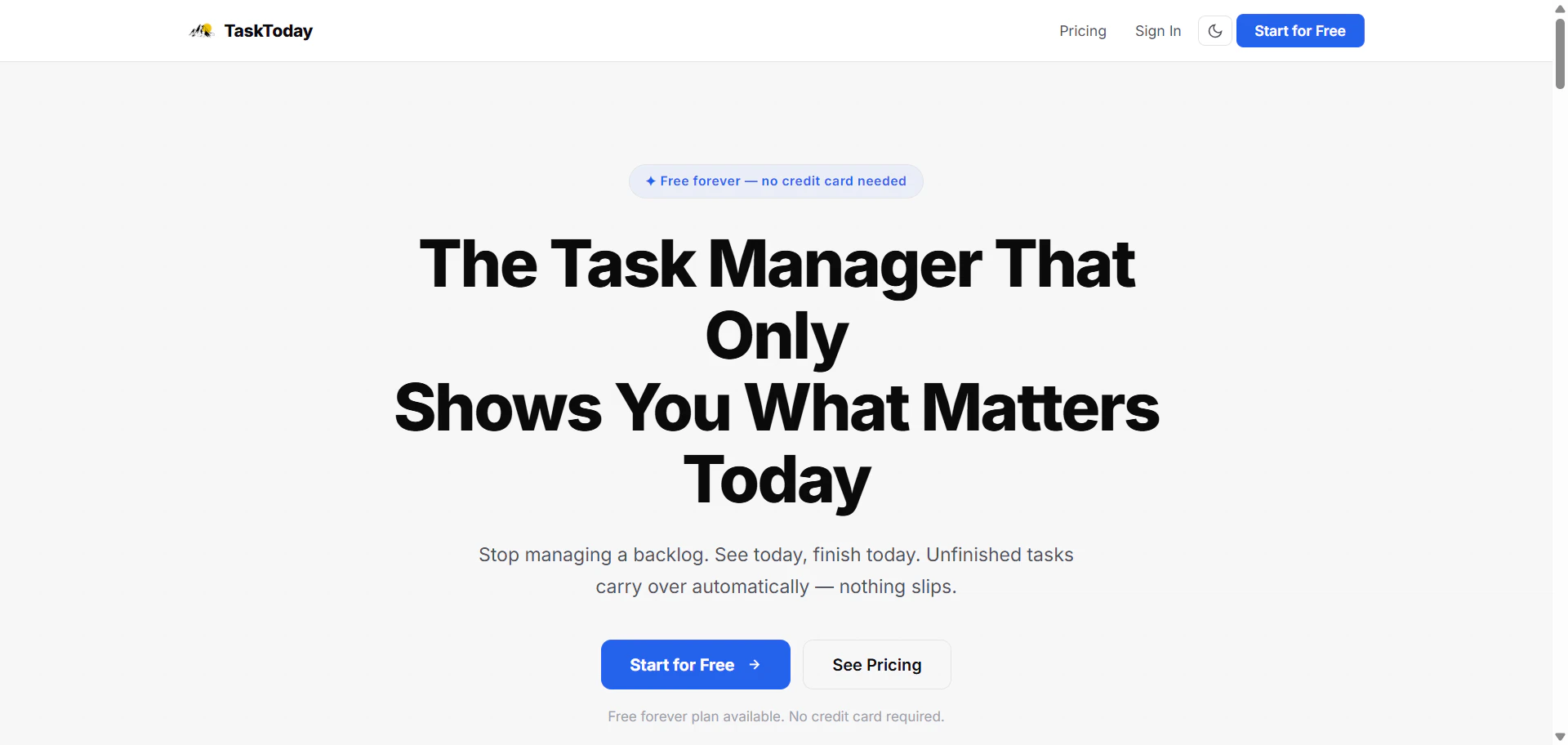 대부분의 태스크 관리 도구는 모든 업무를 한 번에 보여주어 사용을 중단하게 만듭니다. TaskToday는 오늘 할 일만 보여주며, 미완료된 업무는 자동으로 이월됩니다. 백로그 정리나 압도감 없이, 앱을 열고 바로 시작할 수 있습니다.